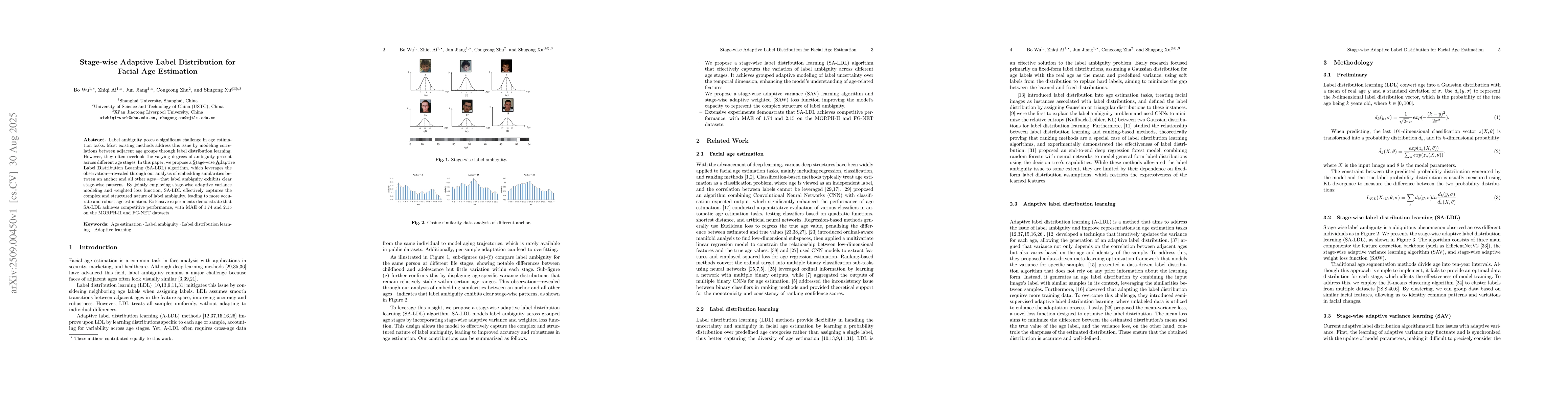 Label ambiguity poses a significant challenge in age estimation tasks. Most existing methods address this issue by modeling correlations between adjacent age groups through label distribution learning. However, they often overlook the varying degrees of ambiguity present across different age stages. In this paper, we propose a Stage-wise Adaptive Label Distribution Learning (SA-LDL) algorithm, which leverages the observation -- revealed through our analysis of embedding similarities between an anchor and all other ages -- that label ambiguity exhibits clear stage-wise patterns. By jointly employing stage-wise adaptive variance modeling and weighted loss function, SA-LDL effectively captures the complex and structured nature of label ambiguity, leading to more accurate and robust age estimation. Extensive experiments demonstrate that SA-LDL achieves competitive performance, with MAE of 1.74 and 2.15 on the MORPH-II and FG-NET datasets.