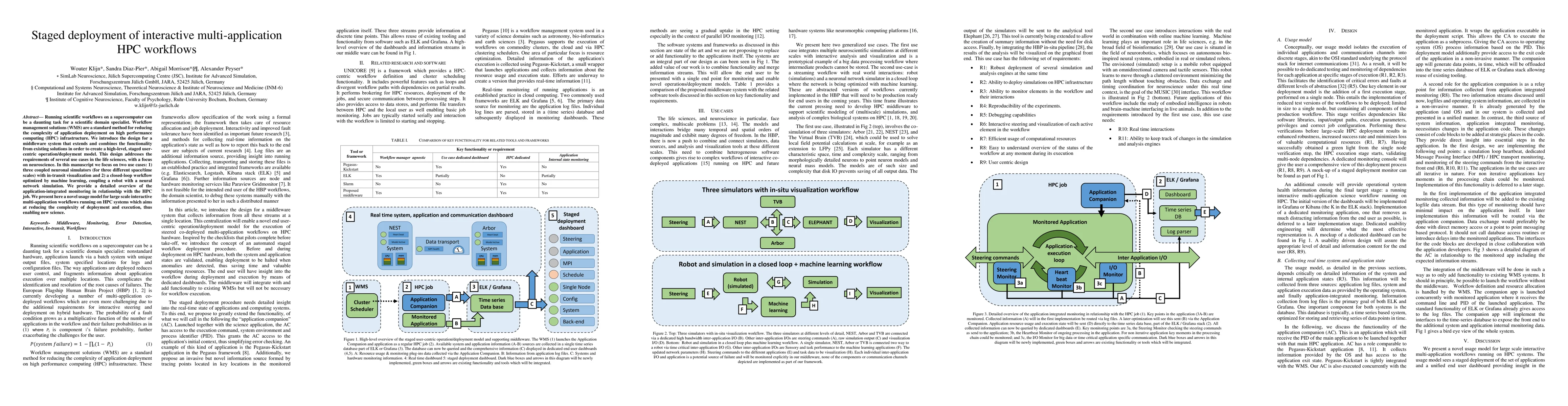 Running scientific workflows on a supercomputer can be a daunting task for a scientific domain specialist. Workflow management solutions (WMS) are a standard method for reducing the complexity of application deployment on high performance computing (HPC) infrastructure. We introduce the design for a middleware system that extends and combines the functionality from existing solutions in order to create a high-level, staged user-centric operation/deployment model. This design addresses the requirements of several use cases in the life sciences, with a focus on neuroscience. In this manuscript we focus on two use cases: 1) three coupled neuronal simulators (for three different space/time scales) with in-transit visualization and 2) a closed-loop workflow optimized by machine learning, coupling a robot with a neural network simulation. We provide a detailed overview of the application-integrated monitoring in relationship with the HPC job. We present here a novel usage model for large scale interactive multi-application workflows running on HPC systems which aims at reducing the complexity of deployment and execution, thus enabling new science.