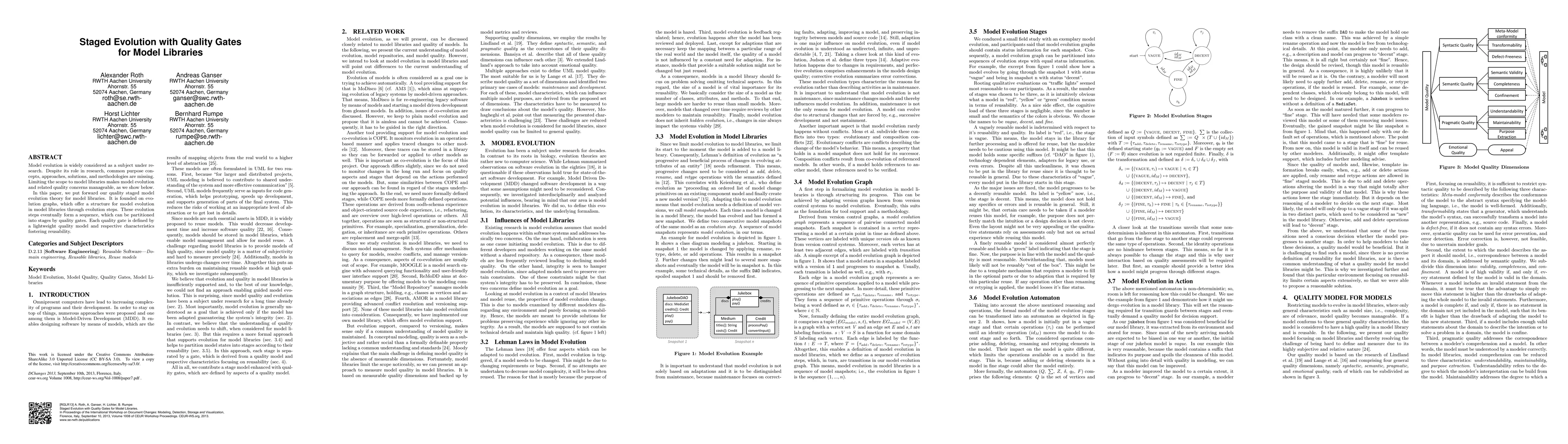 Model evolution is widely considered as a subject under research. Despite its role in research, common purpose concepts, approaches, solutions, and methodologies are missing. Limiting the scope to model libraries makes model evolution and related quality concerns manageable, as we show below. In this paper, we put forward our quality staged model evolution theory for model libraries. It is founded on evolution graphs, which offer a structure for model evolution in model libraries through evolution steps. These evolution steps eventually form a sequence, which can be partitioned into stages by quality gates. Each quality gate is defined by a lightweight quality model and respective characteristics fostering reusability.