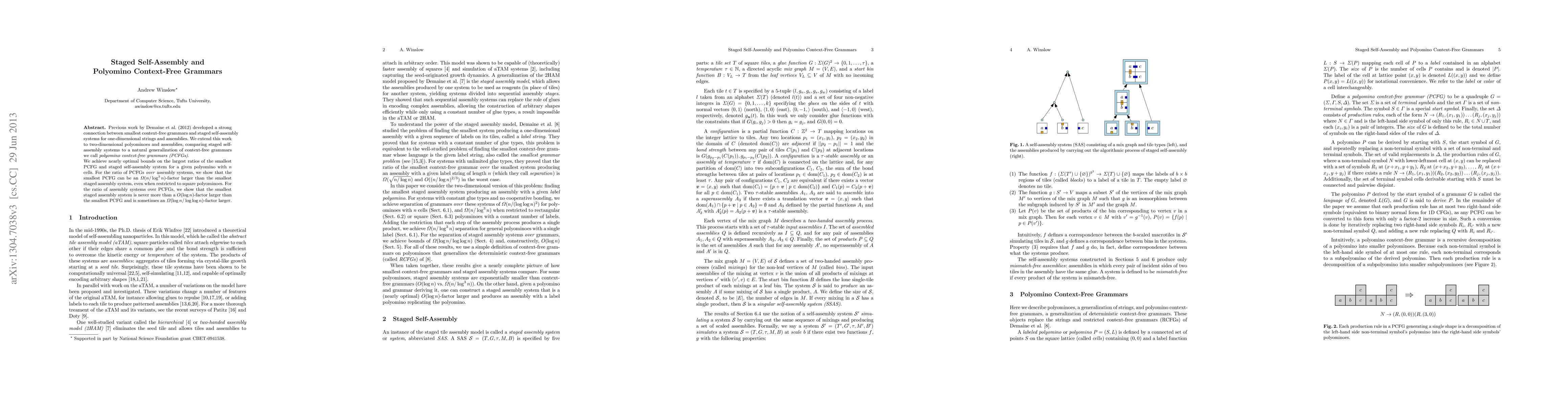 Previous work by Demaine et al. (2012) developed a strong connection between smallest context-free grammars and staged self-assembly systems for one-dimensional strings and assemblies. We extend this work to two-dimensional polyominoes and assemblies, comparing staged self-assembly systems to a natural generalization of context-free grammars we call polyomino context-free grammars (PCFGs). We achieve nearly optimal bounds on the largest ratios of the smallest PCFG and staged self-assembly system for a given polyomino with n cells. For the ratio of PCFGs over assembly systems, we show the smallest PCFG can be an Omega(n/(log(n))^3)-factor larger than the smallest staged assembly system, even when restricted to square polyominoes. For the ratio of assembly systems over PCFGs, we show that the smallest staged assembly system is never more than a O(log(n))-factor larger than the smallest PCFG and is sometimes an Omega(log(n)/loglog(n))-factor larger.