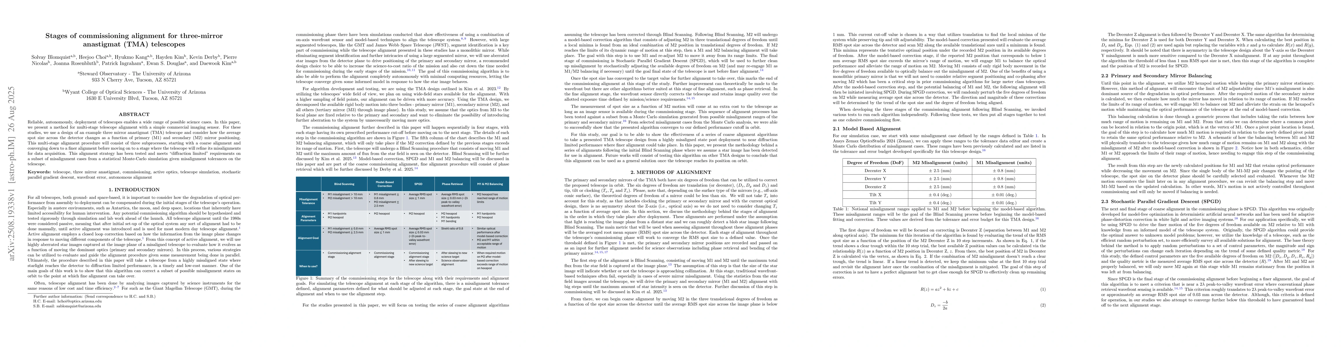 Reliable, autonomously, deployment of telescopes enables a wide range of possible science cases. In this paper, we present a method for multi-stage telescope alignment with a simple commercial imaging sensor. For these studies, we use a design of an example three mirror anastigmat telescope and consider how the average spot size across the detector changes as a function of primary and secondary mirror positioning. This multi-stage alignment procedure will consist of three subprocesses, starting with a coarse alignment and converging down to a finer alignment before moving on to a stage where the telescope will refine its misalignments for data acquisition. This alignment strategy has been tested and meets diffraction limited requirements on a subset of misalignment cases from a statistical Monte Carlo simulation given misalignment tolerances on the telescope.