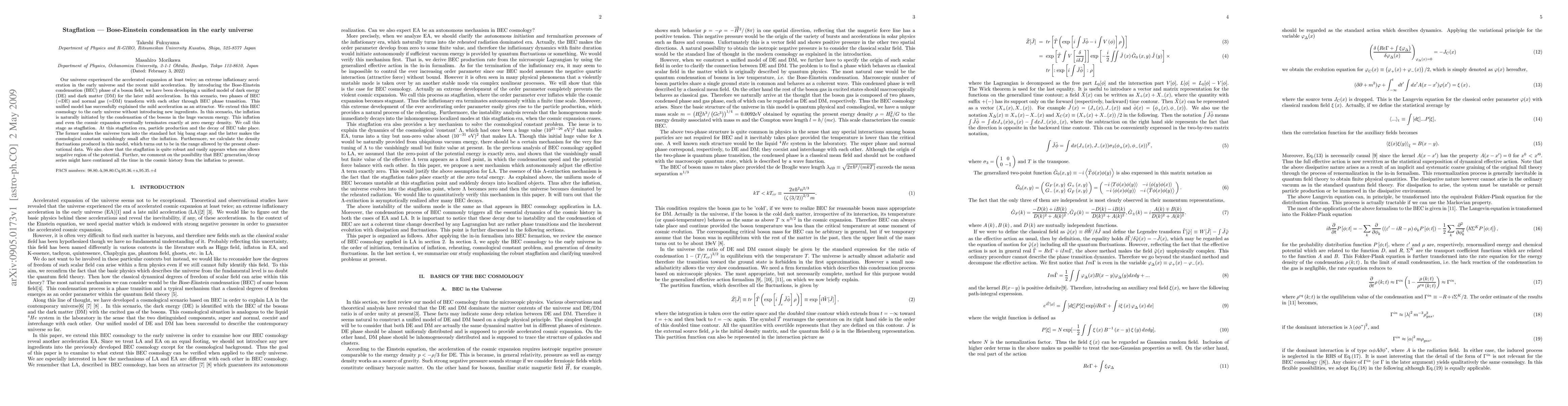 Researchers propose a unified model of dark energy and dark matter that explains accelerated expansion in the early universe through Bose-Einstein condensation, culminating in 'stagflation' where inflation ends at zero energy density.
