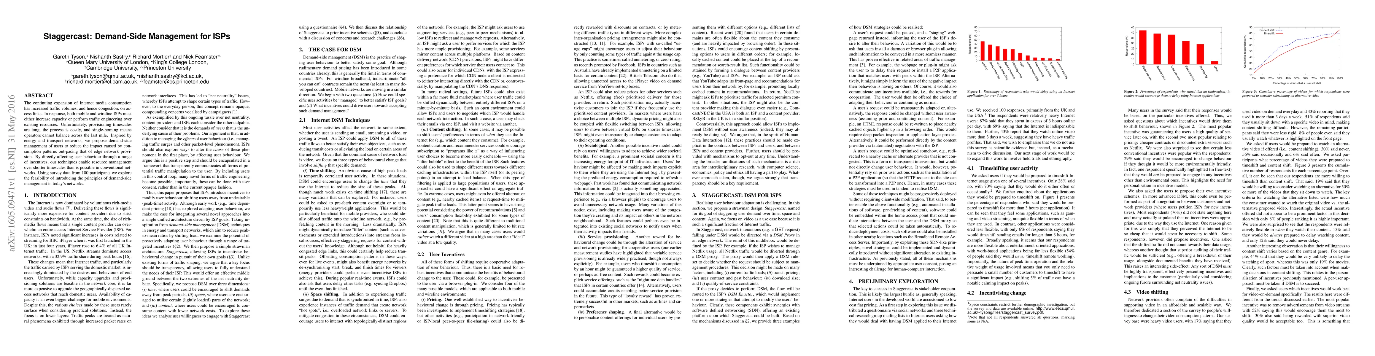 The paper 'Staggercast: Democratic Management for ISPs' proposes using demand-side management to mitigate network congestion caused by rising Internet media consumption. By influencing user behavior with incentives, it suggests managing network resources more efficiently over shorter timescales than traditional methods. The proposal is backed by a survey of 100 participants.