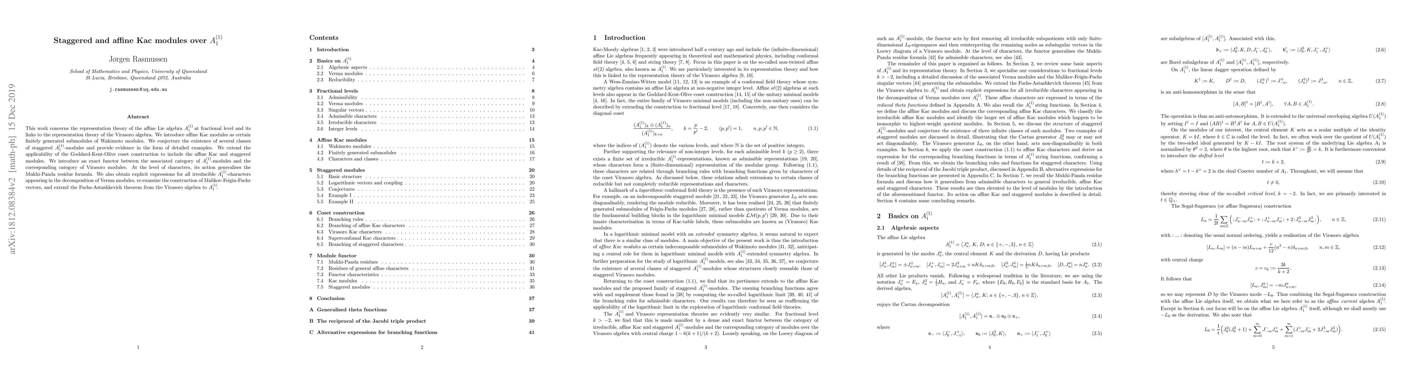 This paper explores the representation theory of $A_1^{(1)}$ affine Lie algebra at fractional levels, introducing affine Kac modules and proposing staggered classes linked to Virasoro algebra. It establishes an exact functor between $A_1^{(1)}$-modules and Virasoro modules, extending the Goddard-Kent-Olive coset construction.