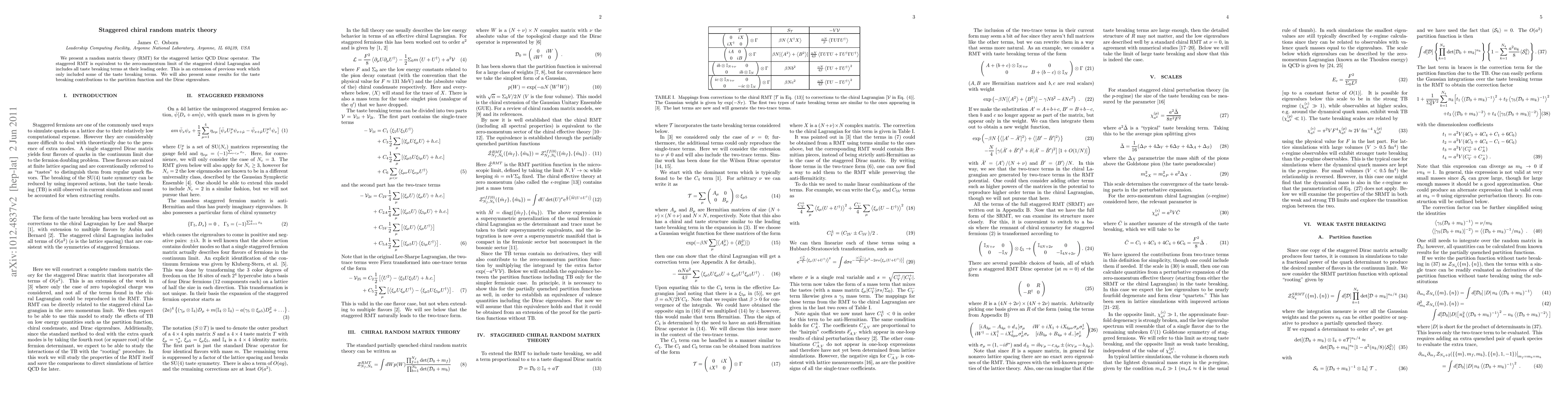 This paper introduces a random matrix theory for the staggered lattice QCD Dirac operator, extending previous work by including all leading-order taste breaking terms. It also presents results for the taste breaking contributions to the partition function and Dirac eigenvalues.