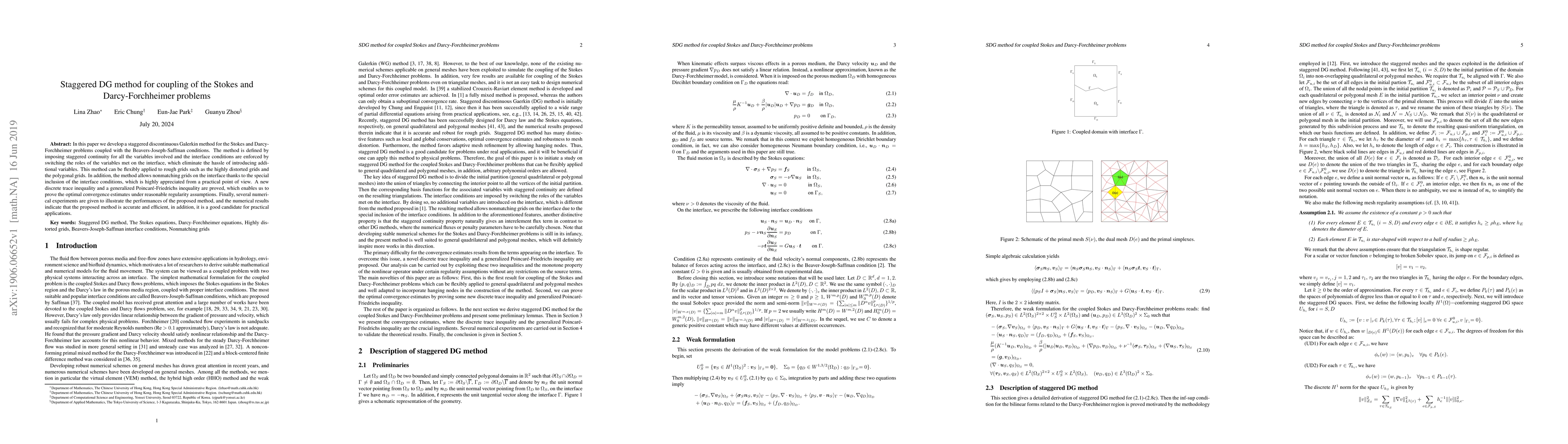 In this paper we develop a staggered discontinuous Galerkin method for the Stokes and Darcy-Forchheimer problems coupled with the \Red{Beavers-Joseph-Saffman} conditions. The method is defined by imposing staggered continuity for all the variables involved and the interface conditions are enforced by switching the roles of the variables met on the interface, which eliminate the hassle of introducing additional variables. This method can be flexibly applied to rough grids such as the highly distorted grids and the polygonal grids. In addition, the method allows nonmatching grids on the interface thanks to the special inclusion of the interface conditions, which is highly appreciated from a practical point of view. A new discrete trace inequality and a generalized Poincar\'{e}-Friedrichs inequality are proved, which enables us to prove the optimal convergence estimates under reasonable regularity assumptions. Finally, several numerical experiments are given to illustrate the performances of the proposed method, and the numerical results indicate that the proposed method is accurate and efficient, in addition, it is a good candidate for practical applications.