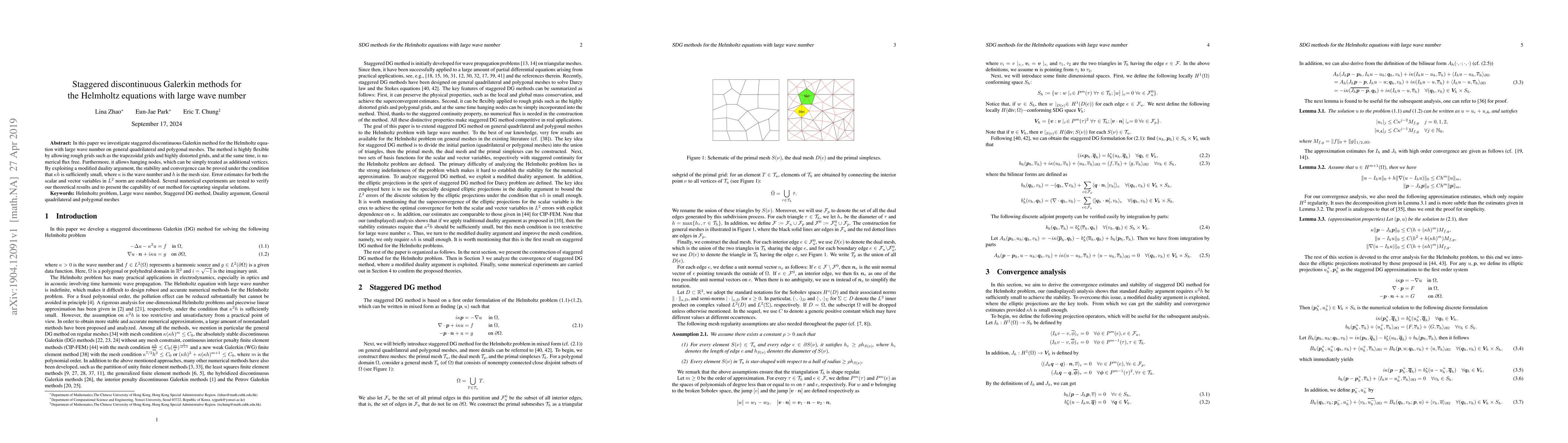 A new staggered discontinuous Galerkin method is proposed for solving Helmholtz equations with large wave numbers on complex grids, offering flexibility and numerical flux-free capabilities.