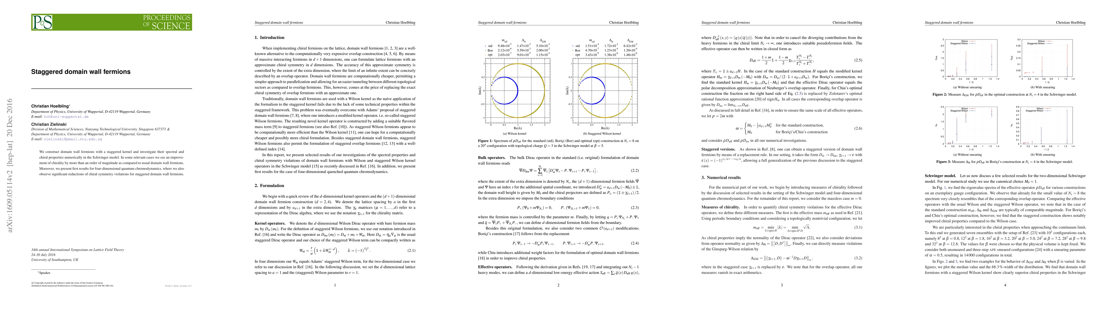 The paper introduces staggered domain wall fermions and numerically explores their spectral and chiral properties in the Schwinger model, showing an over an order of magnitude improvement in chirality. It also presents initial results for four-dimensional quantum chromodynamics, reporting significant reductions in chiral symmetry violations.