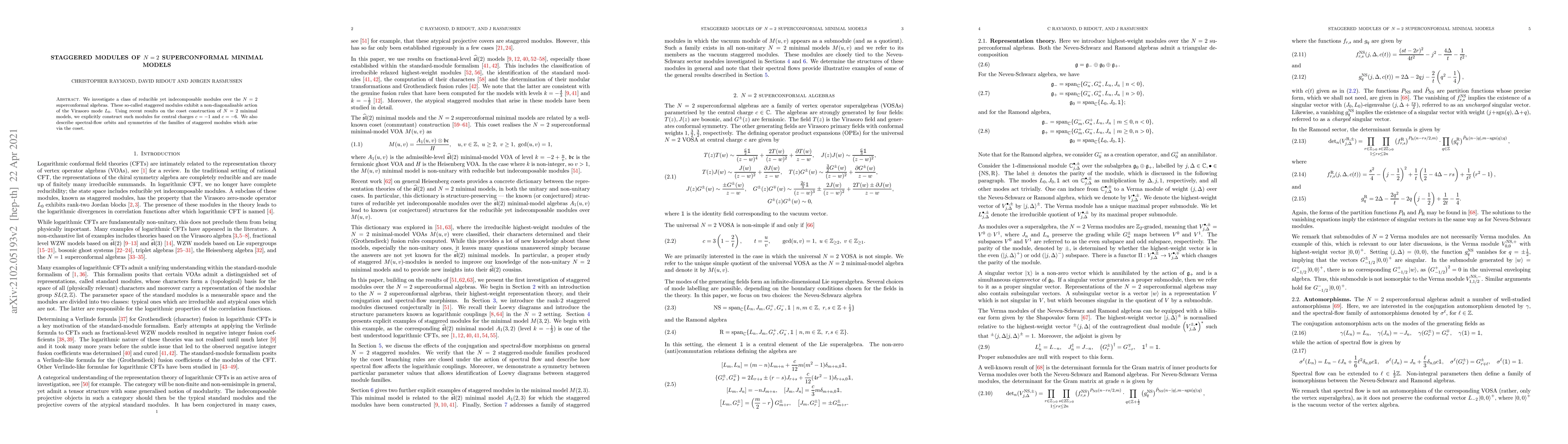 This paper explores the construction and properties of staggered modules in $N=2$ superconformal minimal models, focusing on their non-diagonalizable Virasoro mode $L_{0}$ action. It constructs these modules for central charges $c = -1$ and $c = -6$ using coset construction techniques and analyzes their spectral-flow orbits and symmetries.