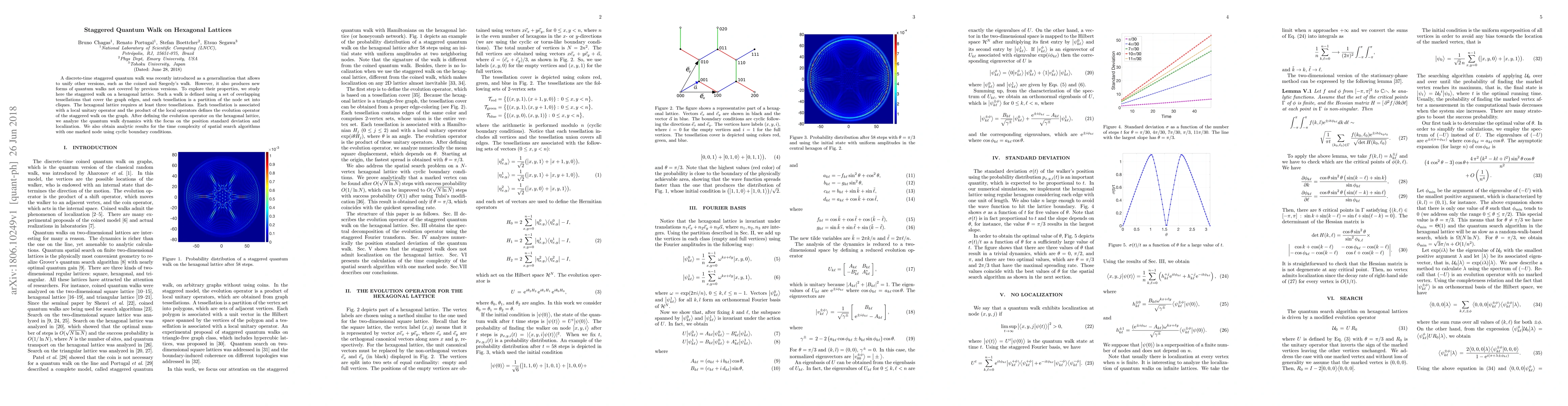 This paper investigates the dynamics of staggered quantum walks on hexagonal lattices, defining the evolution operator using local unitary operators associated with overlapping tessellations. The study focuses on the position standard deviation, localization, and time complexity for spatial search algorithms with one marked node.