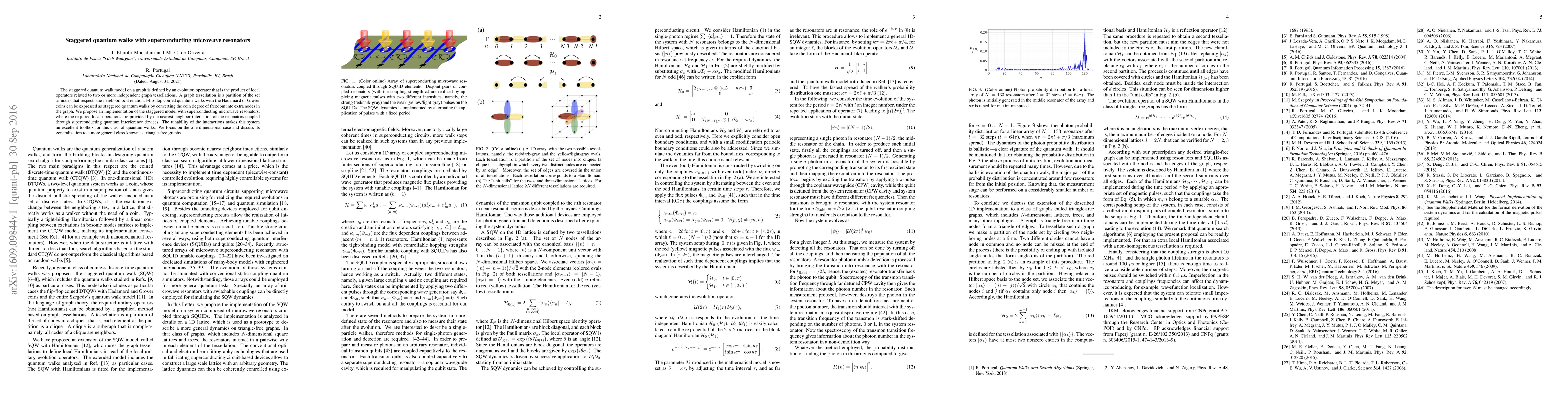 This paper proposes a novel implementation of staggered quantum walks using superconducting microwave resonators, leveraging their tunable interactions for local operations. The authors focus on the one-dimensional case and discuss potential generalizations to triangle-free graphs, highlighting the system's potential as a versatile tool for quantum walk research.