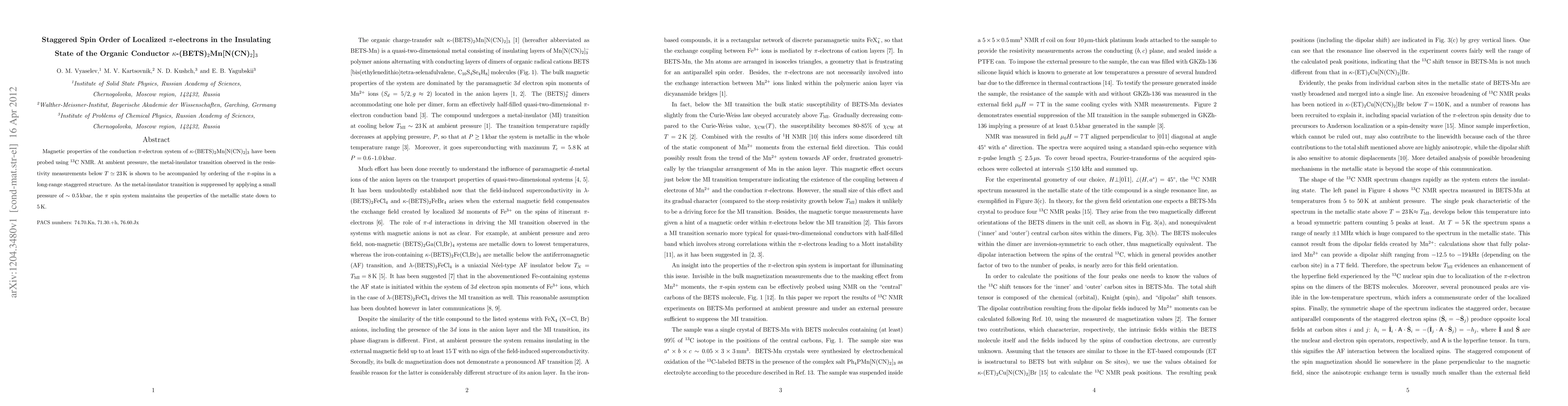 This study investigates the magnetic properties of the organic conductor kappa-BETS)2Mn[N(CN)2]3 using 13C NMR, revealing a staggered spin order in the pi-electrons during the metal-insulator transition below 23K. Applying a small pressure suppresses the transition, maintaining metallic state properties down to 5K.