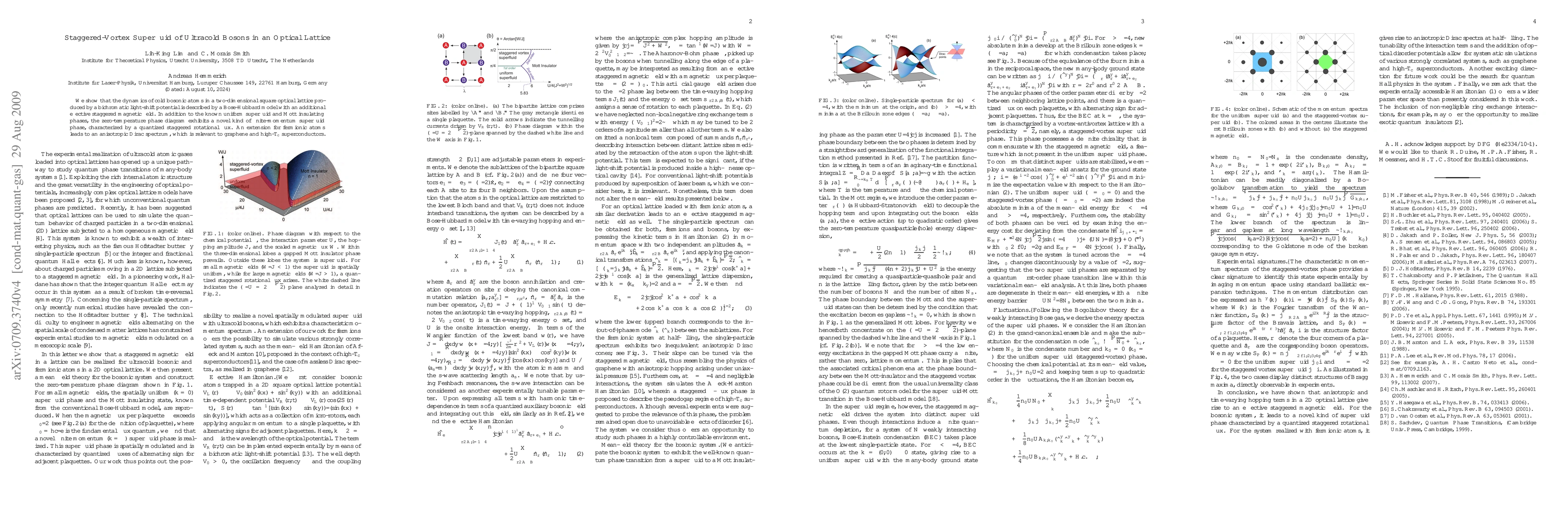 We show that the dynamics of cold bosonic atoms in a two-dimensional square optical lattice produced by a bichromatic light-shift potential is described by a Bose-Hubbard model with an additional effective staggered magnetic field. In addition to the known uniform superfluid and Mott insulating phases, the zero-temperature phase diagram exhibits a novel kind of finite-momentum superfluid phase, characterized by a quantized staggered rotational flux. An extension for fermionic atoms leads to an anisotropic Dirac spectrum, which is relevant to graphene and high-$T_c$ superconductors.