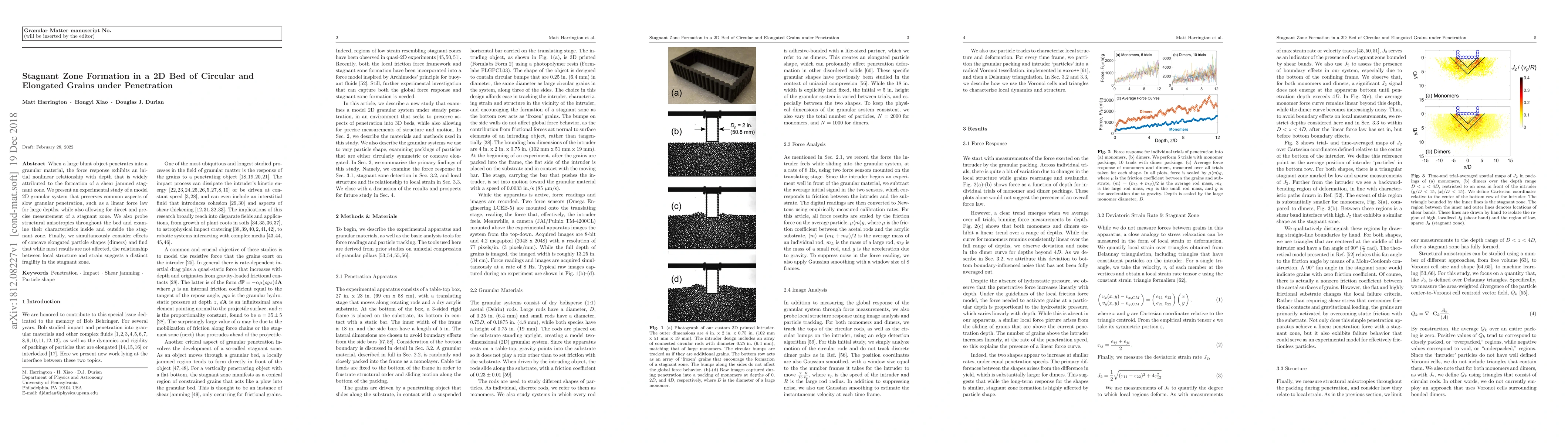 When a large blunt object penetrates into a granular material, the force response exhibits an initial nonlinear relationship with depth that is widely attributed to the formation of a shear jammed stagnant zone. We present an experimental study of a model 2D granular system that preserves common aspects of slow granular penetration, such as a linear force law for large depths, while also allowing for direct and precise measurement of a stagnant zone. We also probe structural anisotropies throughout the bed and examine their characteristics inside and outside the stagnant zone. Finally, we simultaneously consider effects of concave elongated particle shapes (dimers) and find that while most results are not affected, the relationship between local structure and strain suggests a distinct fragility in the stagnant zone.