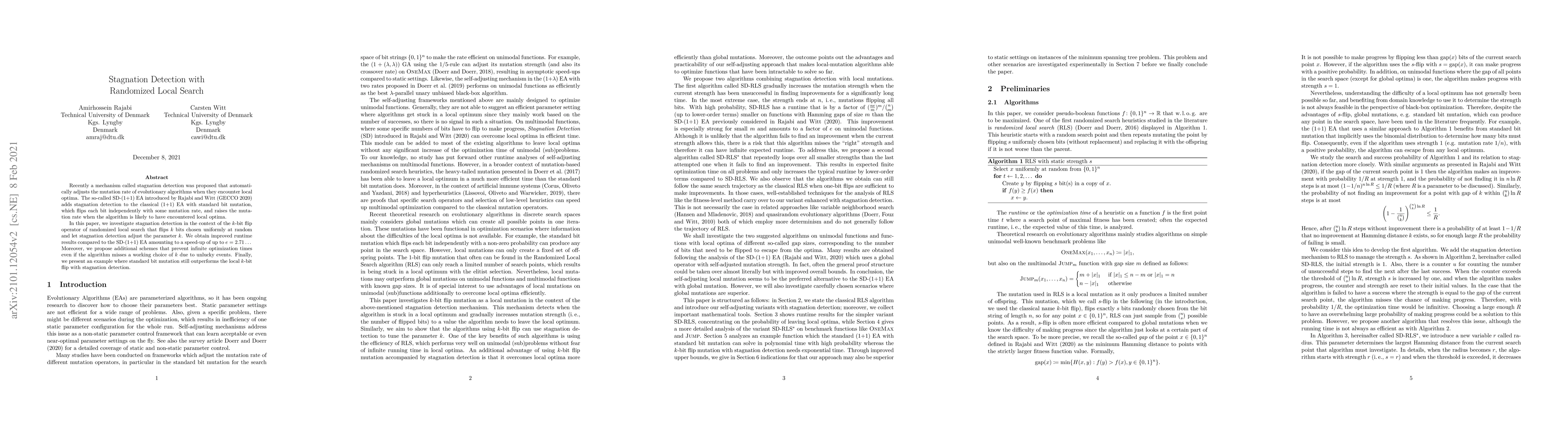 Researchers investigated stagnation detection in randomized local search, improving runtime results with a speed-up of up to 2.71, and proposed schemes to prevent infinite optimization times.