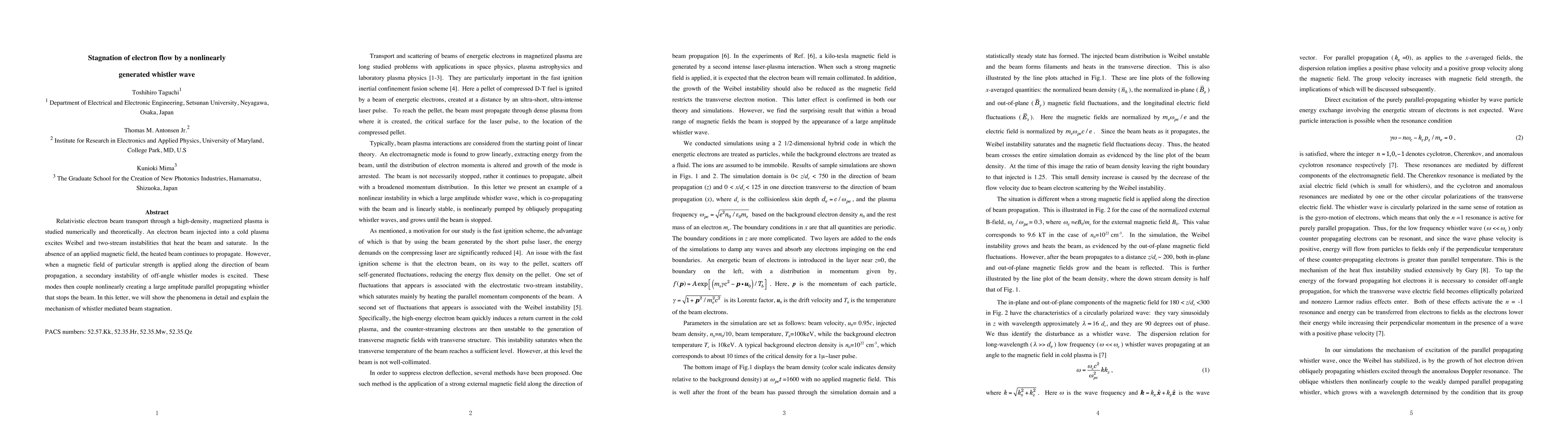 This paper investigates the stagnation of relativistic electron beams in magnetized plasmas, revealing that a nonlinearly generated whistler wave can halt beam propagation when a specific magnetic field strength is applied. The study combines numerical simulations and theoretical analysis to explain the mechanism behind this phenomenon.