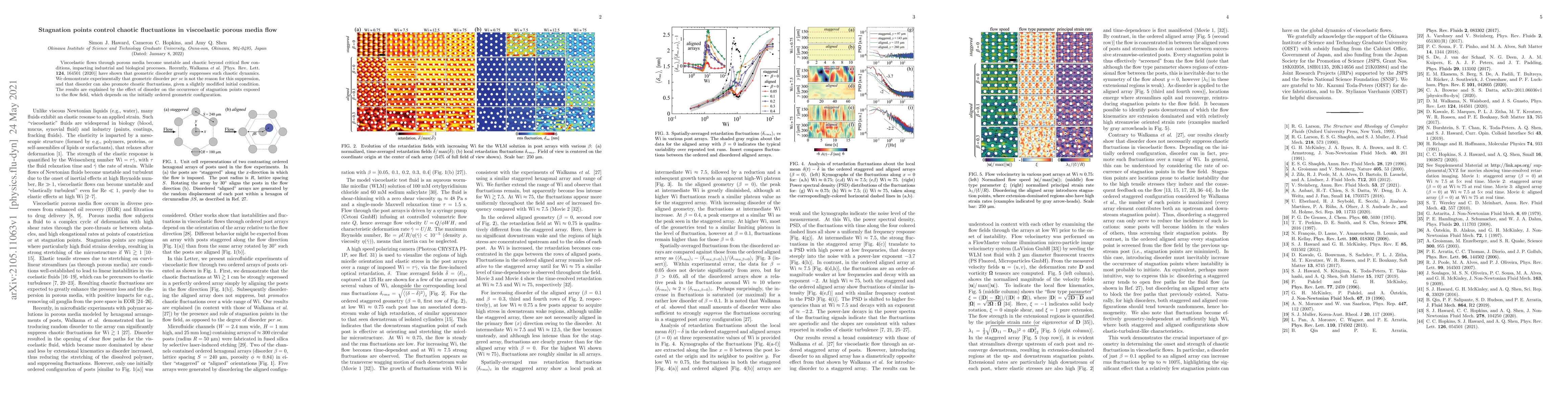 This paper investigates the chaotic dynamics in viscoelastic flows through porous media, revealing that stagnation points play a crucial role in controlling these fluctuations. Contrary to previous findings, the study shows that geometric disorder can either suppress or promote chaos depending on the initial configuration, highlighting the significance of stagnation points in flow dynamics.