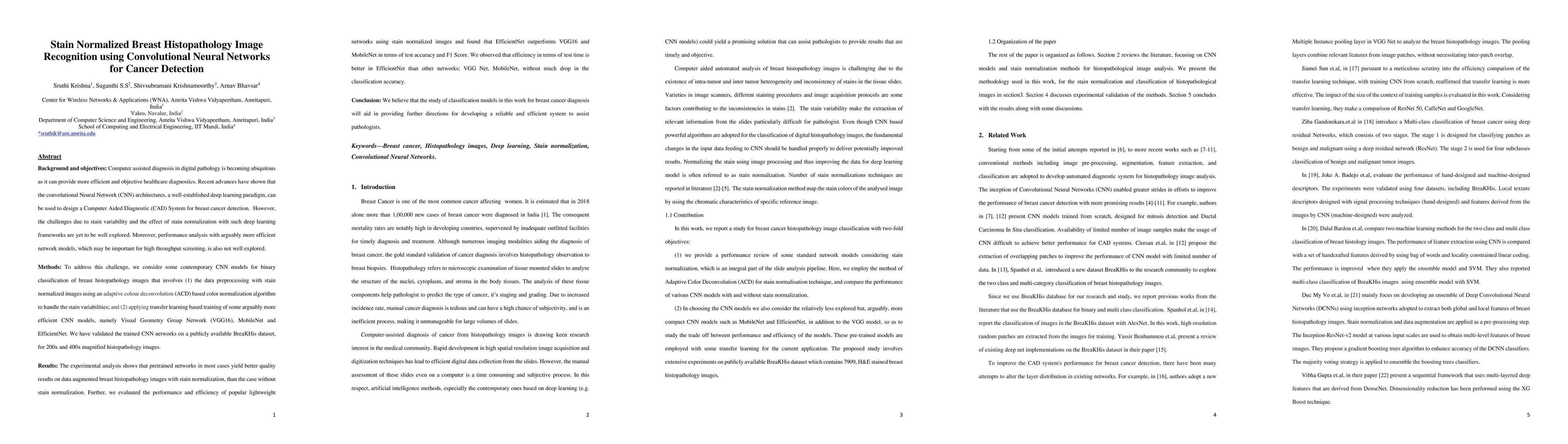 This paper explores the use of convolutional neural networks (CNNs) for breast cancer detection in histopathology images, focusing on stain normalization and transfer learning. Experiments with VGG16, MobileNet, and EfficientNet show that stain normalization and pretrained networks improve diagnostic accuracy, with EfficientNet outperforming others in accuracy and efficiency.