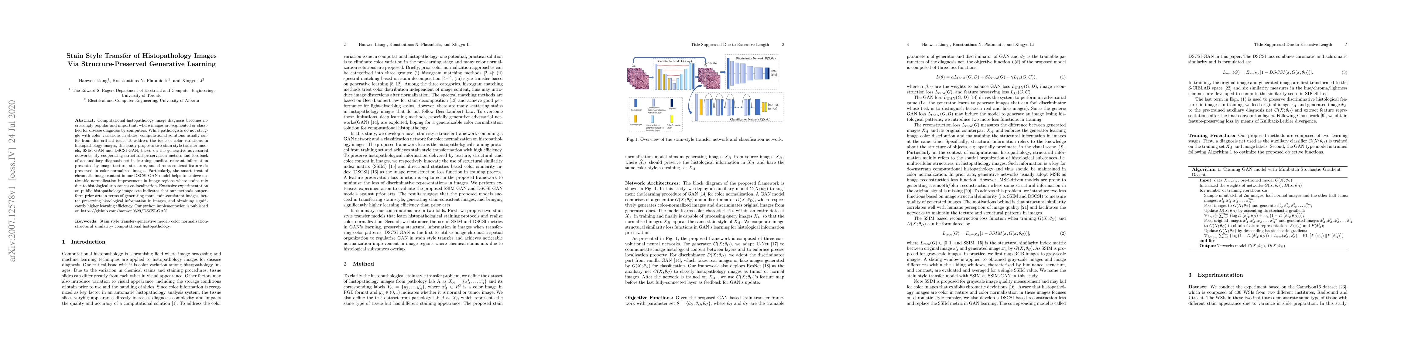 Computational histopathology image diagnosis becomes increasingly popular and important, where images are segmented or classified for disease diagnosis by computers. While pathologists do not struggle with color variations in slides, computational solutions usually suffer from this critical issue. To address the issue of color variations in histopathology images, this study proposes two stain style transfer models, SSIM-GAN and DSCSI-GAN, based on the generative adversarial networks. By cooperating structural preservation metrics and feedback of an auxiliary diagnosis net in learning, medical-relevant information presented by image texture, structure, and chroma-contrast features is preserved in color-normalized images. Particularly, the smart treat of chromatic image content in our DSCSI-GAN model helps to achieve noticeable normalization improvement in image regions where stains mix due to histological substances co-localization. Extensive experimentation on public histopathology image sets indicates that our methods outperform prior arts in terms of generating more stain-consistent images, better preserving histological information in images, and obtaining significantly higher learning efficiency. Our python implementation is published on https://github.com/hanwen0529/DSCSI-GAN.