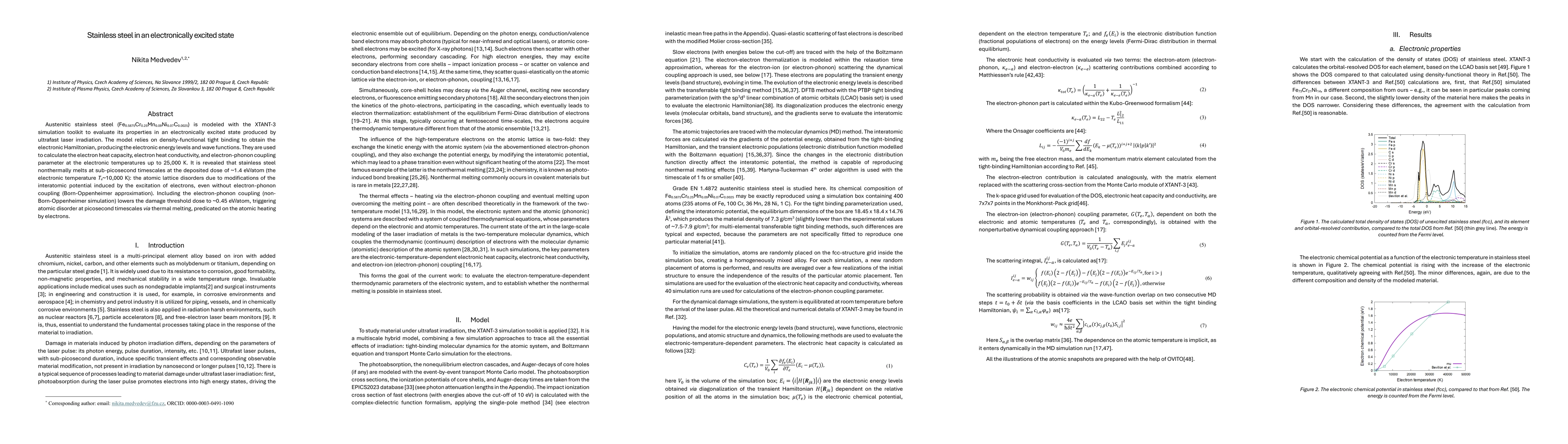 Researchers model austenitic stainless steel in an electronically excited state after ultrafast laser irradiation, finding it melts nonthermally at sub-picosecond timescales without electron-phonon coupling, but at picosecond timescales with coupling.