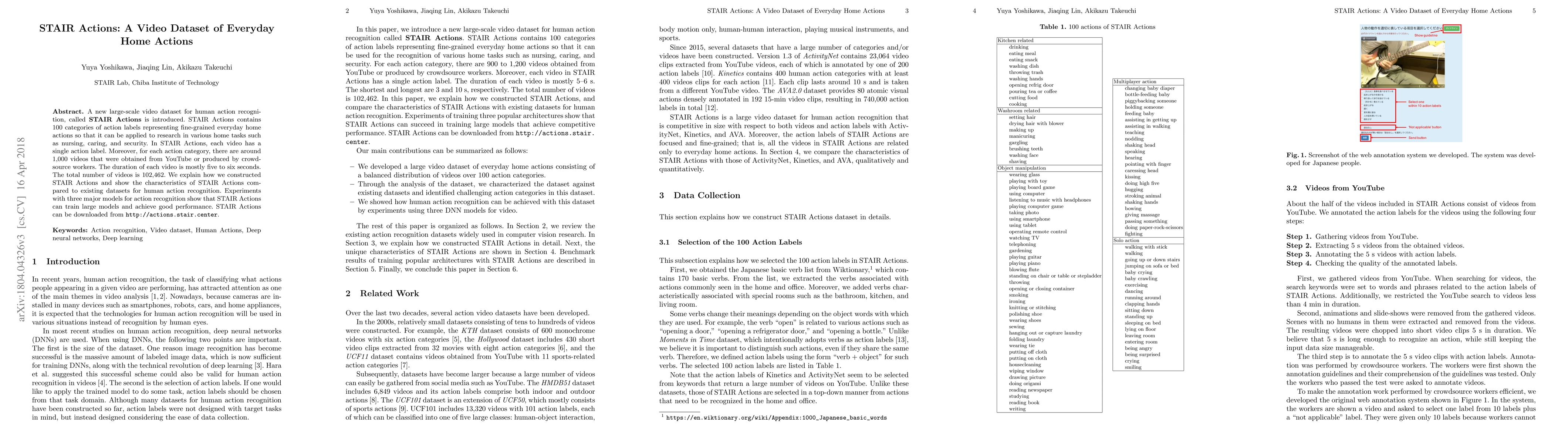 A new large-scale video dataset for human action recognition, called STAIR Actions is introduced. STAIR Actions contains 100 categories of action labels representing fine-grained everyday home actions so that it can be applied to research in various home tasks such as nursing, caring, and security. In STAIR Actions, each video has a single action label. Moreover, for each action category, there are around 1,000 videos that were obtained from YouTube or produced by crowdsource workers. The duration of each video is mostly five to six seconds. The total number of videos is 102,462. We explain how we constructed STAIR Actions and show the characteristics of STAIR Actions compared to existing datasets for human action recognition. Experiments with three major models for action recognition show that STAIR Actions can train large models and achieve good performance. STAIR Actions can be downloaded from http://actions.stair.center