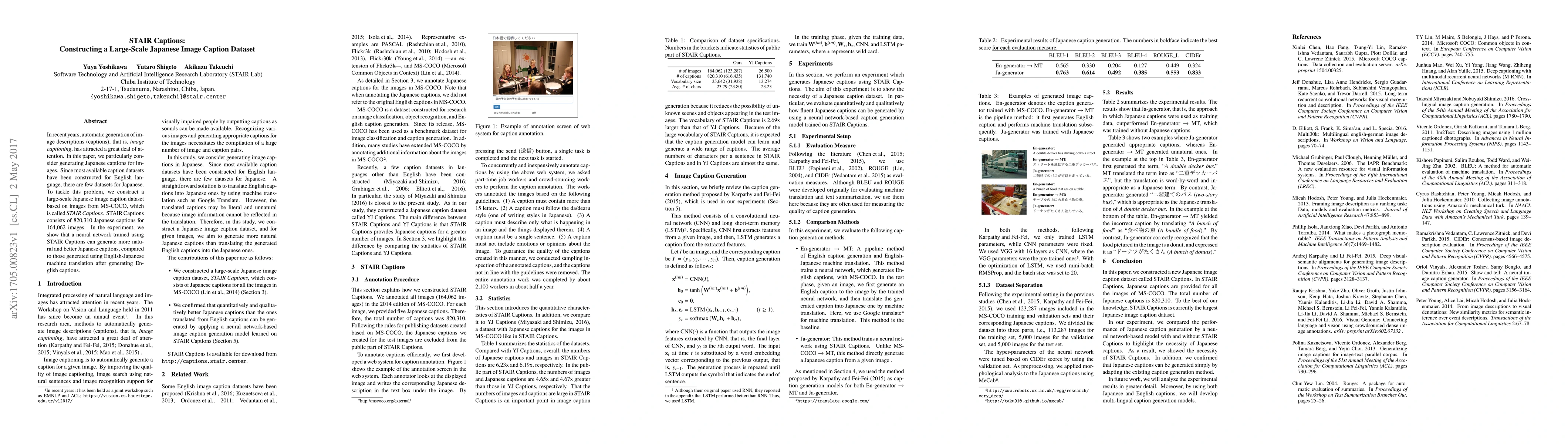 This paper constructs a large-scale Japanese image caption dataset named STAIR Captions, consisting of 820,310 Japanese captions for 164,062 images from MS-COCO. Experiments show that neural networks trained on this dataset generate more natural Japanese captions than those produced via English-Japanese machine translation.