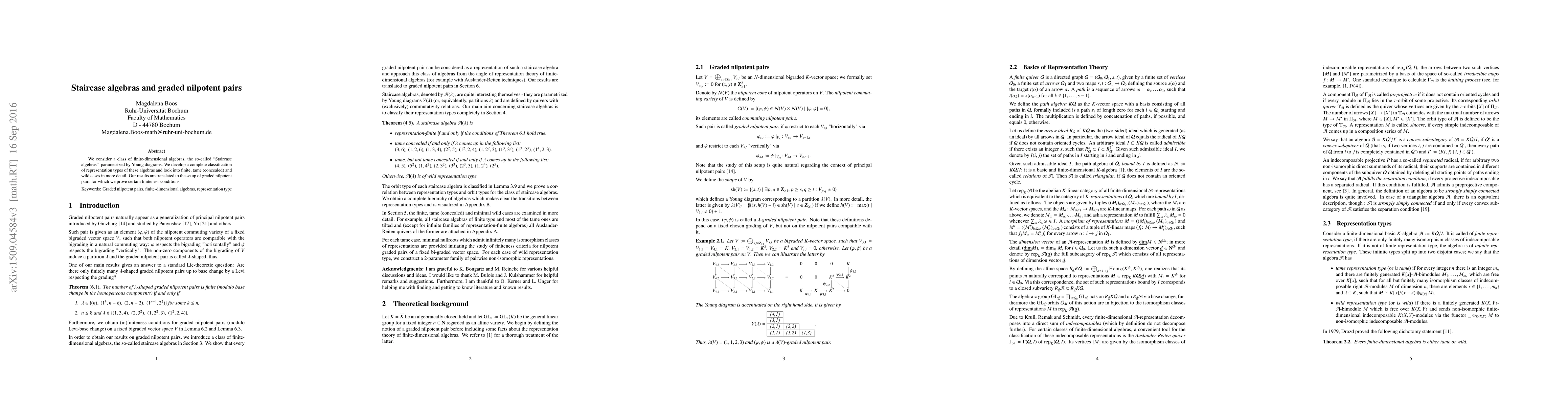We consider a class of finite-dimensional algebras, the so-called "Staircase algebras" parametrized by Young diagrams. We develop a complete classification of representation types of these algebras and look into finite, tame (concealed) and wild cases in more detail. Our results are translated to the setup of graded nilpotent pairs for which we prove certain finiteness conditions.