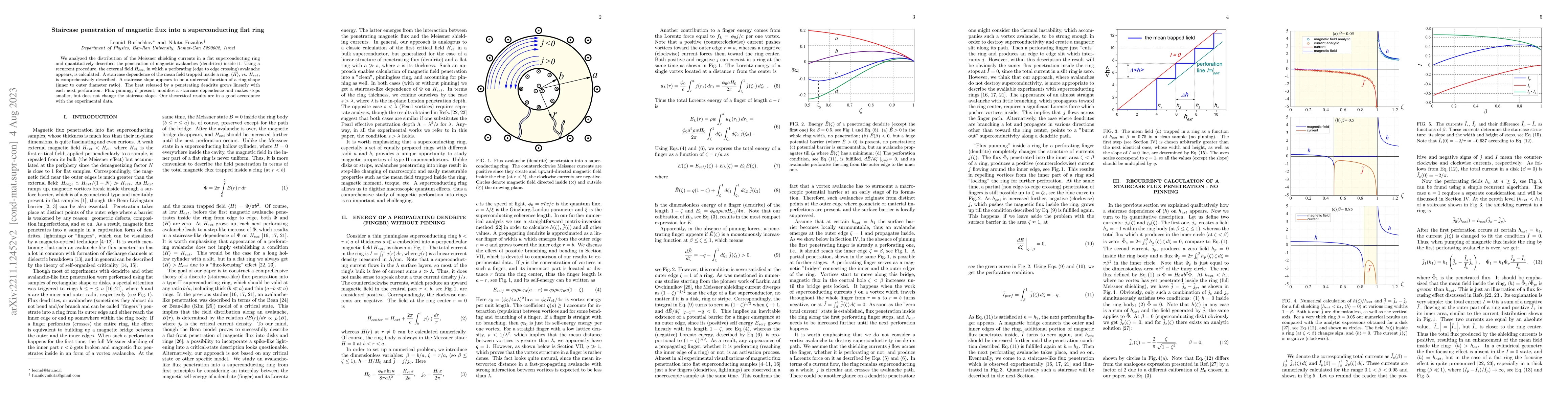 This paper investigates the magnetic flux penetration into a superconducting flat ring, revealing a staircase dependence of the trapped mean field versus the external field. The study finds that flux avalanches create a universal staircase slope dependent on the ring shape, with each avalanche releasing heat proportionally. Flux pinning reduces the step size. Theoretical findings align well with experimental observations.