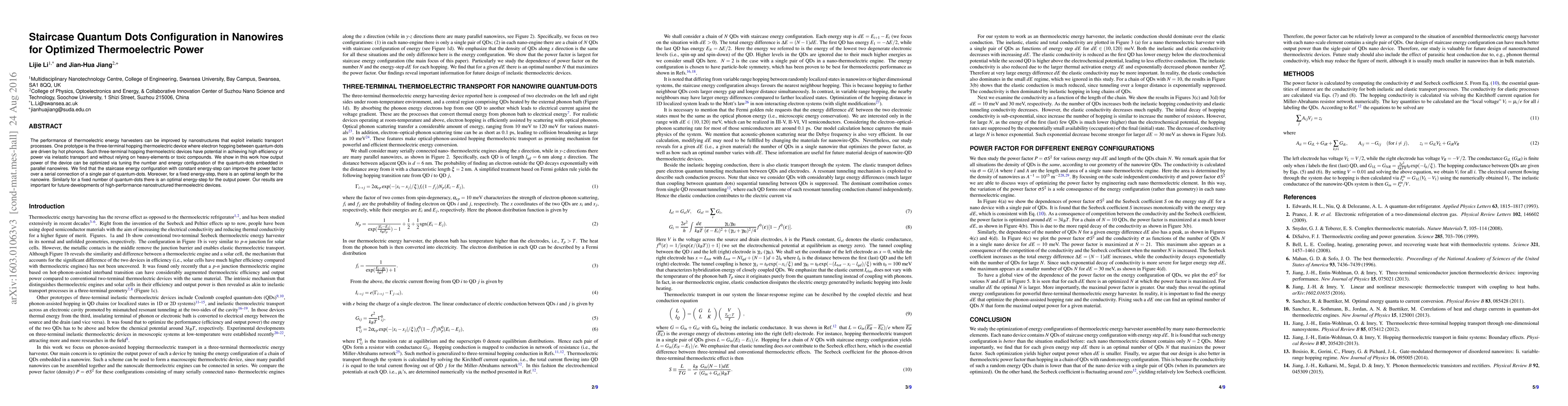 The performance of thermoelectric energy harvesters can be improved by nanostructures that exploit inelastic transport processes. One prototype is the three-terminal hopping thermoelectric device where electron hopping between quantum-dots are driven by hot phonons. Such three-terminal hopping thermoelectric devices have potential in achieving high efficiency or power via inelastic transport and without relying on heavy-elements or toxic compounds. We show in this work how output power of the device can be optimized via tuning the number and energy configuration of the quantum-dots embedded in parallel nanowires. We find that the staircase energy configuration with constant energy-step can improve the power factor over a serial connection of a single pair of quantum-dots. Moreover, for a fixed energy-step, there is an optimal length for the nanowire. Similarly for a fixed number of quantum-dots there is an optimal energy-step for the output power. Our results are important for future developments of high-performance nanostructured thermoelectric devices.