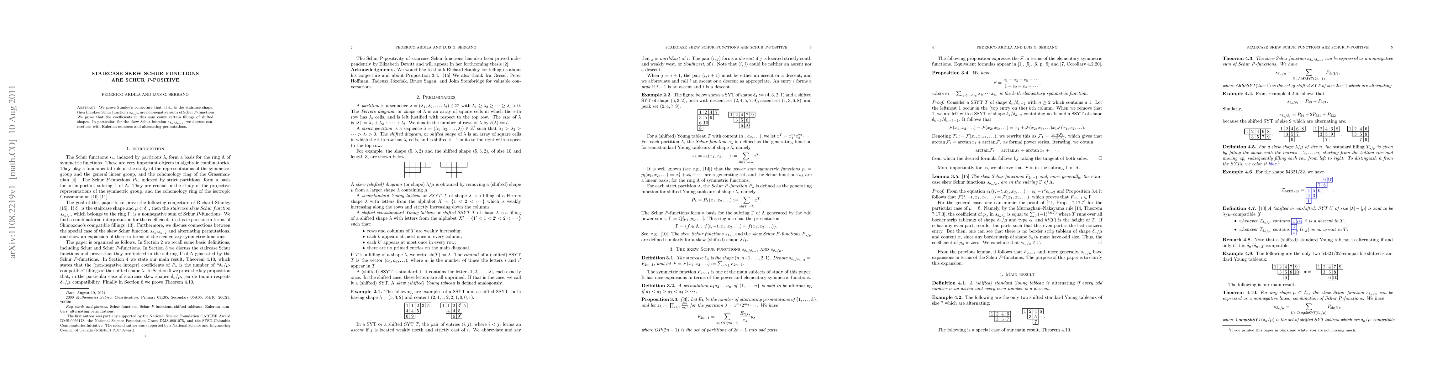 This paper proves Stanley's conjecture that skew Schur functions associated with staircase shapes are Schur P-positive, showing that their coefficients count specific fillings of shifted shapes. It also explores connections between these functions and Eulerian numbers and alternating permutations.