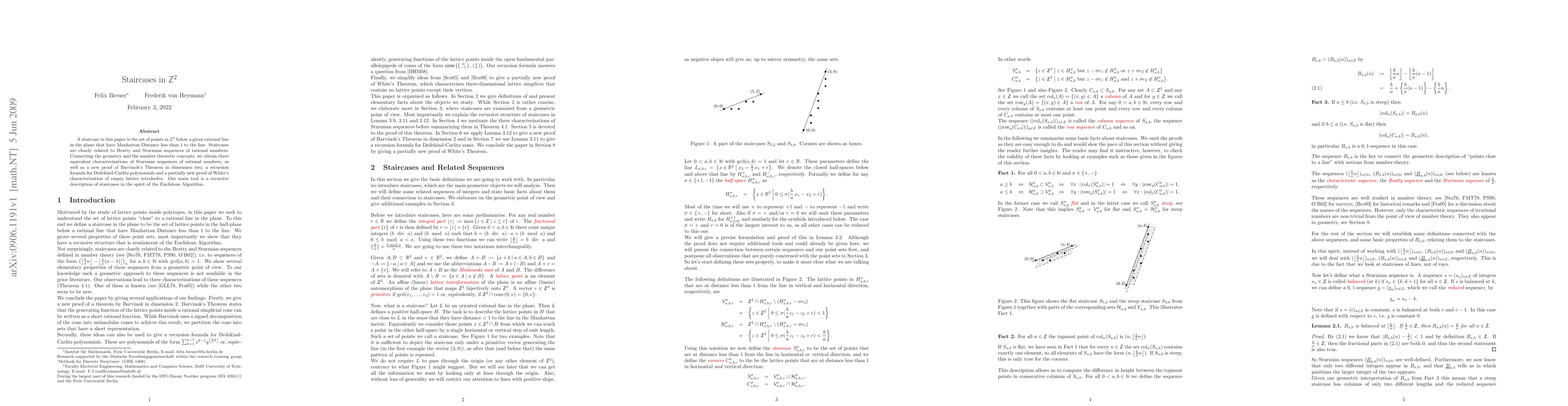 A staircase is the set of points in Z^2 below a given rational line in the plane that have Manhattan Distance less than 1 to the line. Staircases are closely related to Beatty and Sturmian sequences of rational numbers. Connecting the geometry and the number theoretic concepts, we obtain three equivalent characterizations of Sturmian sequences of rational numbers, as well as a new proof of Barvinok's Theorem in dimension two, a recursion formula for Dedekind-Carlitz polynomials and a partially new proof of White's characterization of empty lattice tetrahedra. Our main tool is a recursive description of staircases in the spirit of the Euclidean Algorithm.
