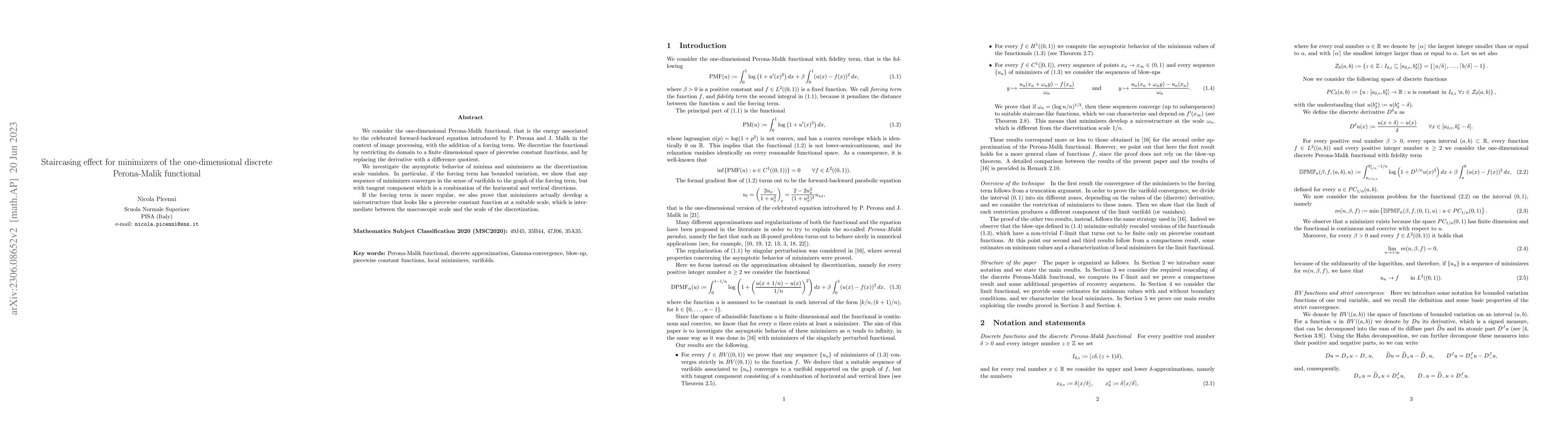 This paper explores the one-dimensional Perona-Malik functional, focusing on its discretized form and the behavior of its minimizers. It demonstrates that minimizers converge to the forcing term's graph with a unique tangent component, and under regularity conditions, develop a microstructure resembling piecewise constant functions.