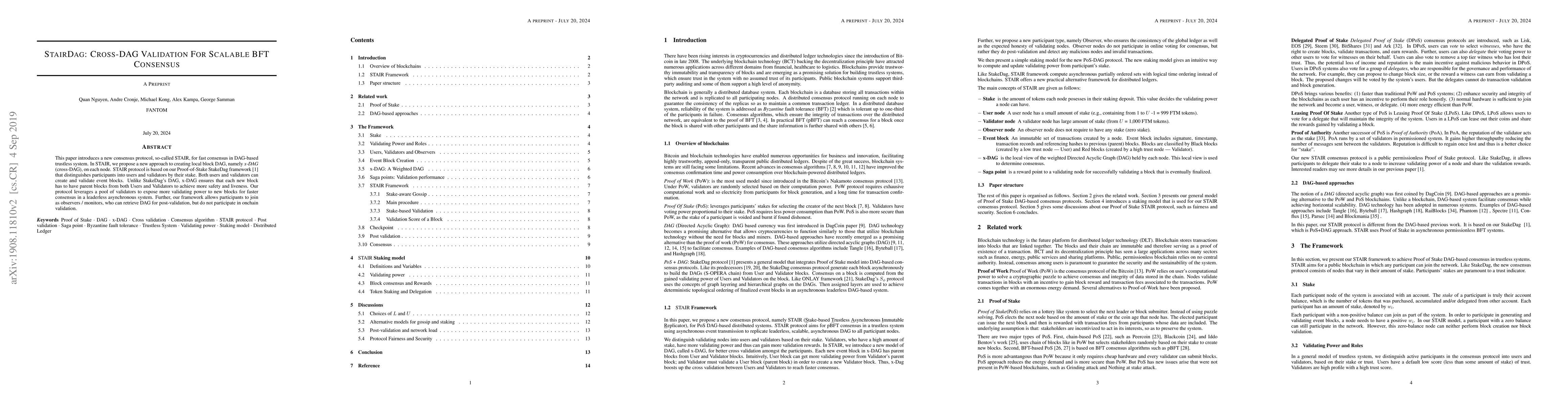 The StairDag protocol proposes a new approach to fast consensus in DAG-based trustless systems, using a cross-DAG (x-DAG) structure that combines user and validator blocks for improved safety and liveness.