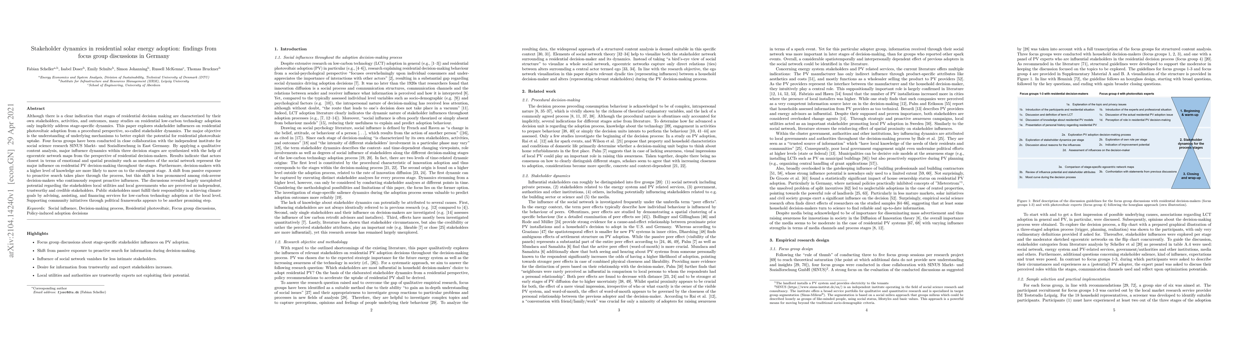 This paper investigates stakeholder dynamics influencing residential solar energy adoption in Germany through focus group discussions. Key findings show that social network members have the most significant impact on decision-making, while local utilities and governments remain underutilized as influential stakeholders. The study emphasizes the need for public stakeholders to support low-carbon technology adoption through advisory, financial, and political frameworks.