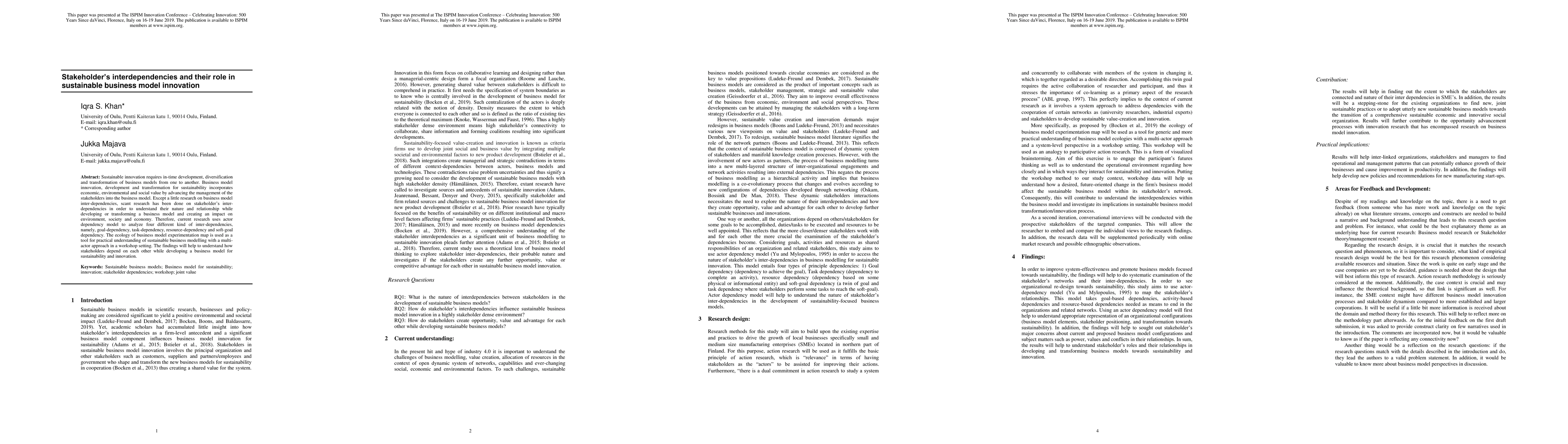 Sustainable innovation requires in-time development, diversification and transformation of business models from one to another. Business model innovation, development and transformation for sustainability incorporates economic, environmental and social value by advancing the management of the stakeholders into the business model. Except a little research on business model inter-dependencies, scant research has been done on stakeholders inter-dependencies in order to understand their nature and relationship while developing or transforming a business model and creating an impact on environment, society and economy. Therefore, current research uses actor dependency model to analyze four different kind of inter-dependencies, namely, goal-dependency, task-dependency, resource-dependency and soft-goal dependency. The ecology of business model experimentation map is used as a tool for practical understanding of sustainable business modelling with a multi-actor approach in a workshop setting. The findings will help to understand how stakeholders depend on each other while developing a business model for sustainability and innovation.