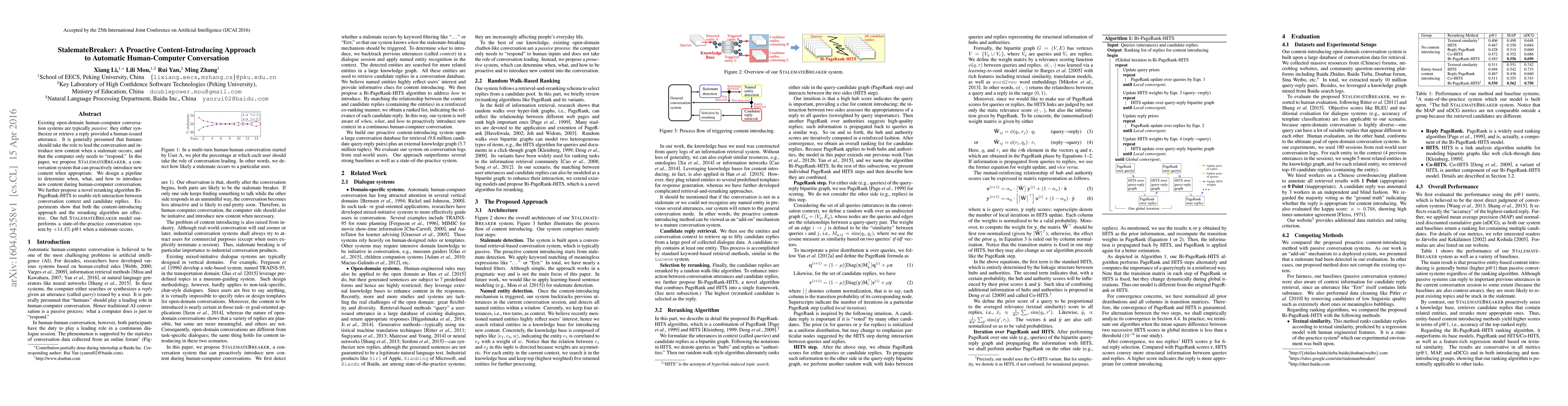 StalemateBreaker introduces a proactive approach to human-computer conversation by enabling the system to introduce new content when a stalemate occurs, enhancing interaction. The system employs a novel reranking algorithm, Bi-PageRank-HITS, to effectively integrate conversation context with candidate replies, outperforming existing systems by 14.4% in relevant reply retrieval.