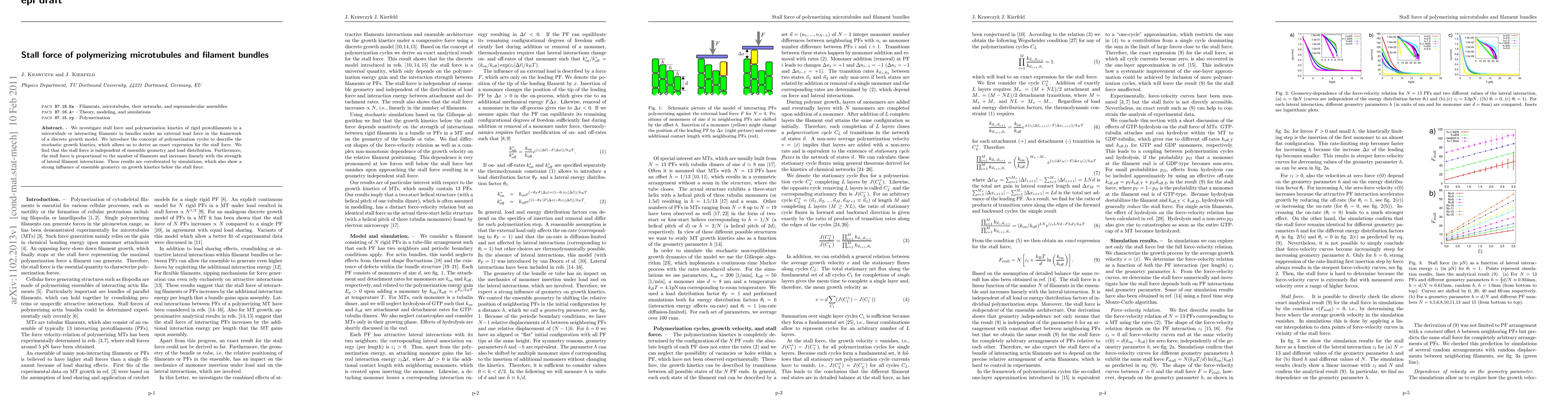 This paper investigates the stall force of polymerizing microtubules and filament bundles using a discrete growth model, finding that the stall force is independent of ensemble geometry and load distribution, and proportional to the number of filaments and lateral interactions. Simulations confirm these findings and highlight the impact of ensemble geometry on growth kinetics below the stall force.