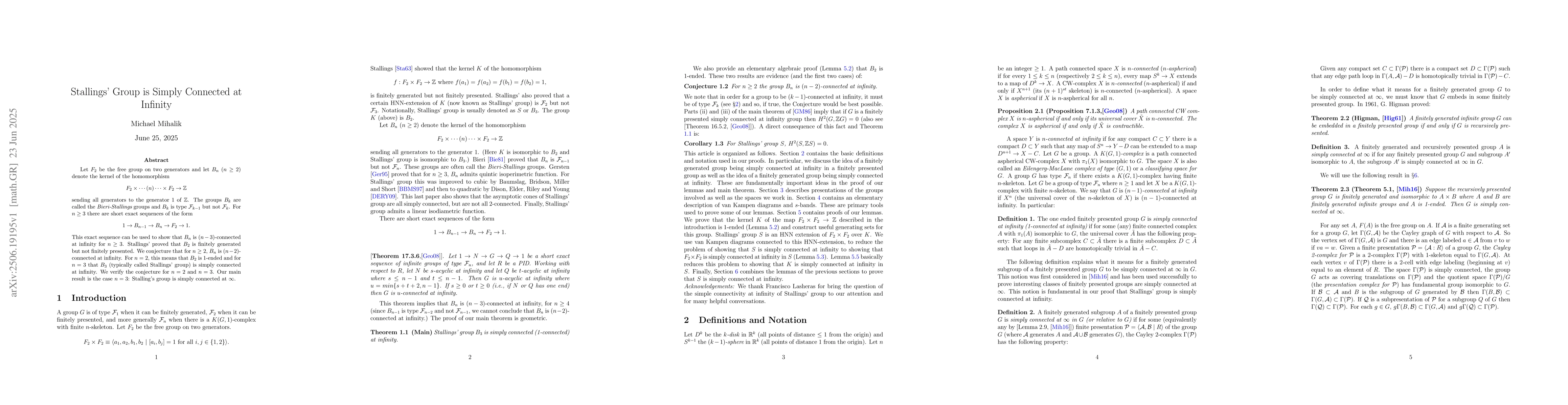 Let $F_2$ be the free group on two generators and let $B_n$ ($n \geq 2$) denote the kernel of the homomorphism $$F_2 \times \cdots (n) \cdots \times F_2 \rightarrow {\mathbb Z}$$ sending all generators to the generator $1$ of $\mathbb Z$. The groups $B_k$ are called the {\it Bieri-Stallings} groups and $B_k$ is type $\mathcal F_{k-1}$ but not $\mathcal F_k$. For $n\geq 3$ there are short exact sequences of the form $$1 \rightarrow B_{n-1} \rightarrow B_n \rightarrow F_2 \rightarrow 1.$$ This exact sequence can be used to show that $B_n$ is $(n-3)$-connected at infinity for $n\geq 3$. Stallings' proved that $B_2$ is finitely generated but not finitely presented. We conjecture that for $n\geq 2$, $B_n$ is $(n-2)$-connected at infinity. For $n=2$, this means that $B_2$ is 1-ended and for $n=3$ that $B_3$ (typically called Stallings' group) is simply connected at infinity. We verify the conjecture for $n=2$ and $n=3$. Our main result is the case $n=3$: Stalling's group is simply connected at $\infty$.
