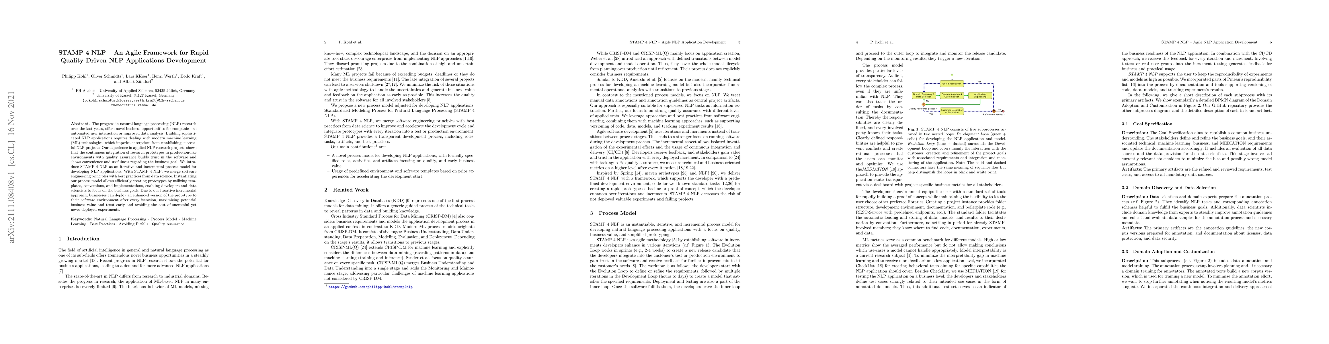 The paper introduces STAMP 4 NLP, an iterative and incremental process model for developing NLP applications, merging software engineering and data science best practices. This approach allows efficient prototype creation, early business value deployment, and trust-building through continuous integration in production-like environments.
