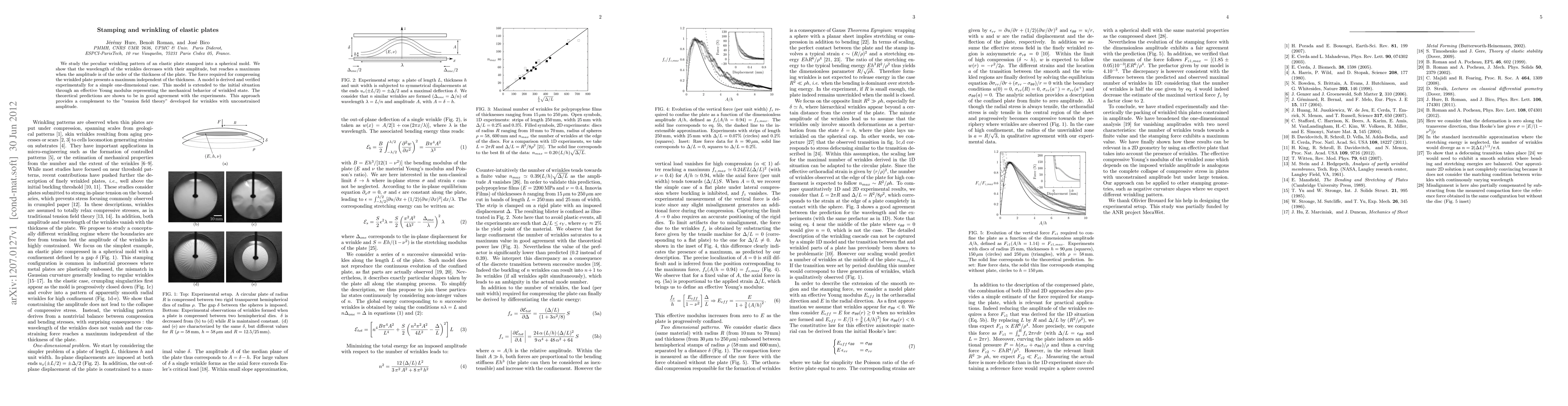 Researchers studied how an elastic plate wrinkles when stamped into a spherical mold, finding that maximum wrinkling occurs at the plate's thickness and that the force required is independent of thickness.