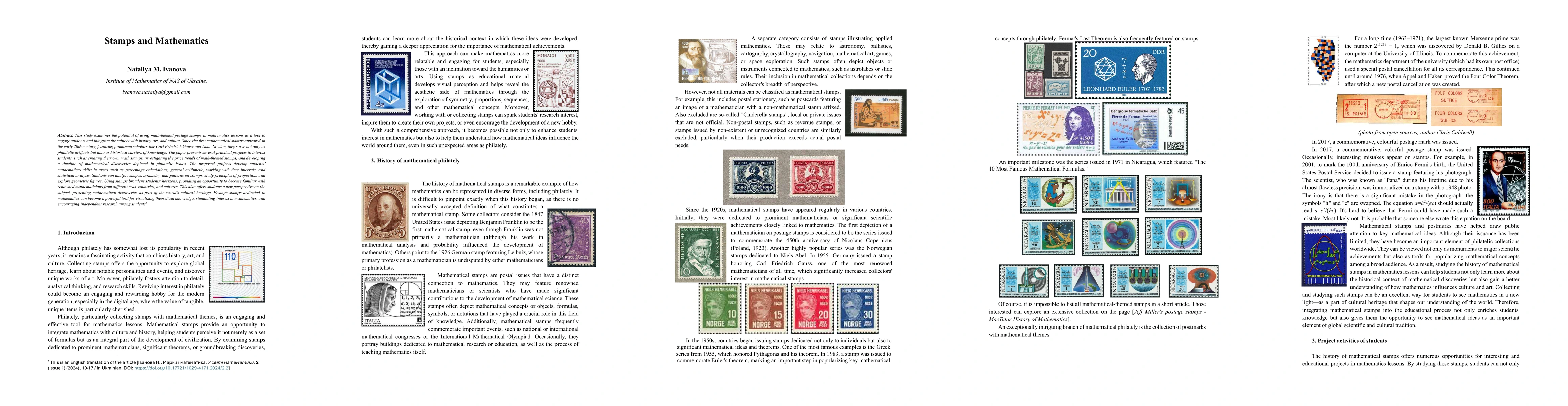 This study examines the potential of using math-themed postage stamps in mathematics lessons as a tool to engage students and integrate the subject with history, art, and culture. Since the first mathematical stamps appeared in the early 20th century, featuring prominent scholars like Carl Friedrich Gauss and Isaac Newton, they serve not only as philatelic artifacts but also as historical carriers of knowledge. The paper presents several practical projects to interest students, such as creating their own math stamps, investigating the price trends of math-themed stamps, and developing a timeline of mathematical discoveries depicted in philatelic issues. The proposed projects develop students' mathematical skills in areas such as percentage calculations, general arithmetic, working with time intervals, and statistical analysis. Students can analyze shapes, symmetry, and patterns on stamps, study principles of proportion, and explore geometric figures. Using stamps broadens students' horizons, providing an opportunity to become familiar with renowned mathematicians from different eras, countries, and cultures. This also offers students a new perspective on the subject, presenting mathematical discoveries as part of the world's cultural heritage. Postage stamps dedicated to mathematics can become a powerful tool for visualizing theoretical knowledge, stimulating interest in mathematics, and encouraging independent research among students.