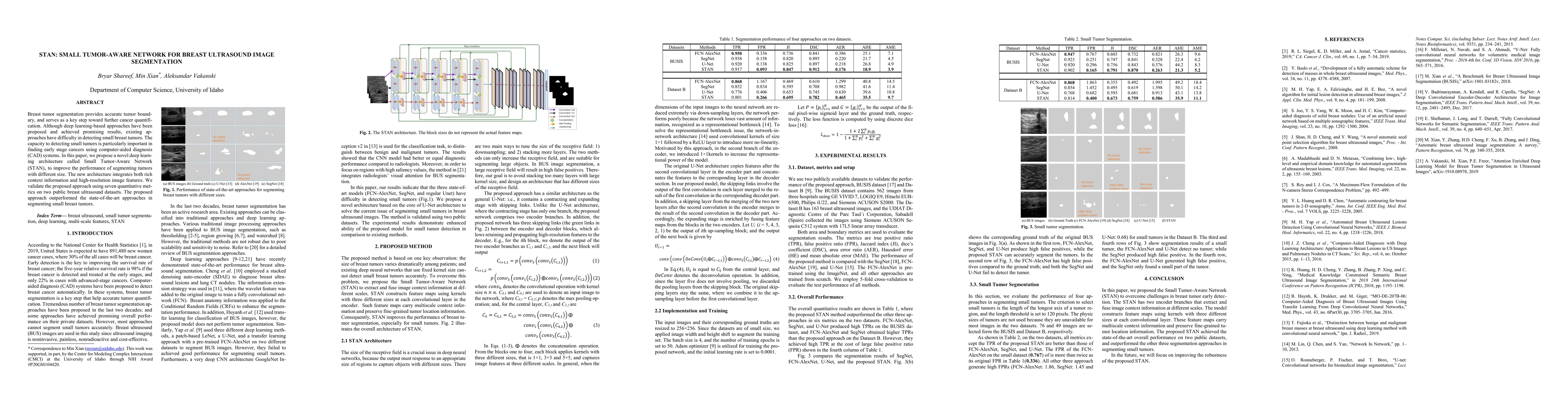 The paper introduces a novel deep learning architecture called Small Tumor-Aware Network (STAN) to improve breast tumor segmentation, especially for small tumors, which is crucial for early cancer detection. The proposed method integrates rich context and high-resolution features, outperforming existing methods on two public datasets.