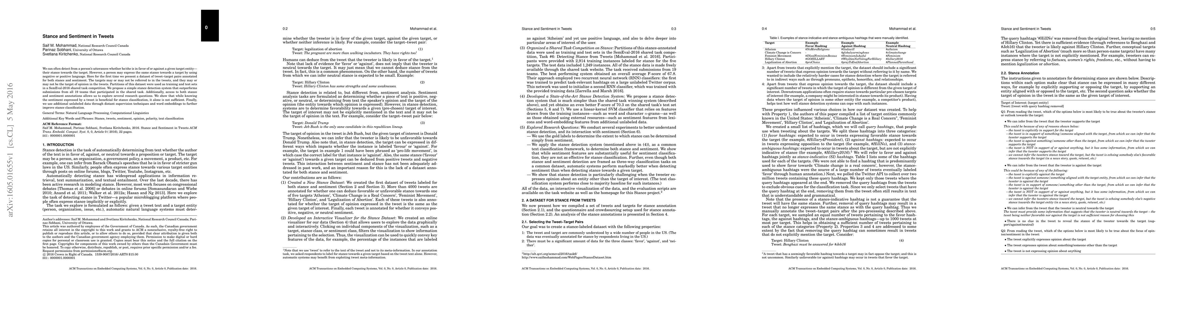 This paper introduces a dataset of tweet-target pairs annotated for stance and sentiment, and presents a stance detection system that outperforms other teams in a SemEval-2016 competition. It finds that while sentiment helps in stance classification, it is not enough on its own, and utilizes unlabeled data and embeddings to enhance the model.