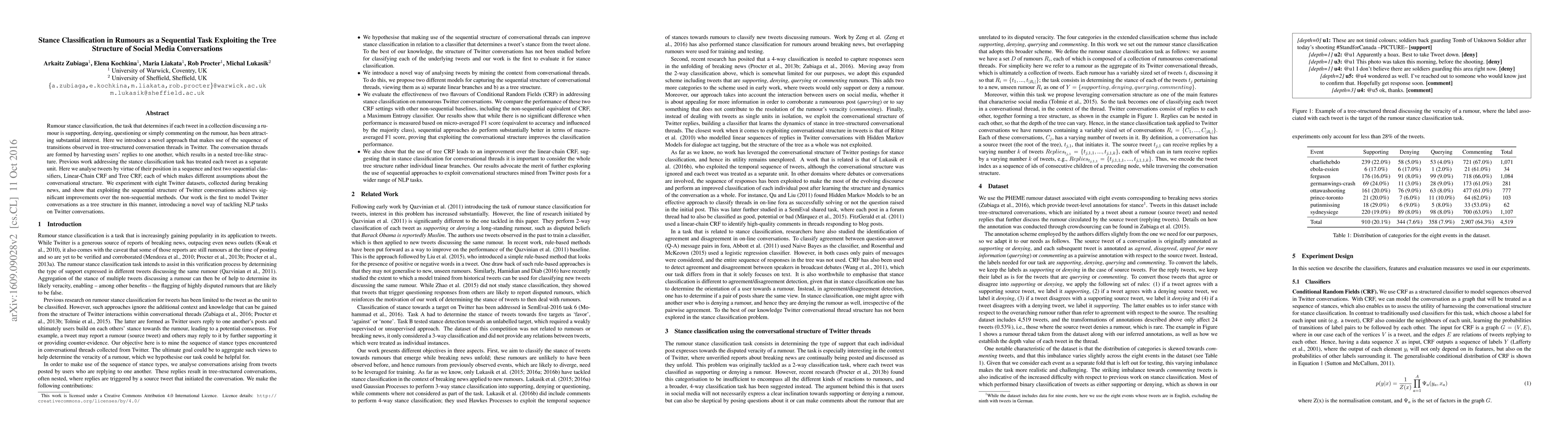 This paper proposes a novel approach for rumour stance classification using sequential analysis of tree-structured Twitter conversations, employing Linear-Chain CRF and Tree CRF classifiers. The study demonstrates significant improvements over non-sequential methods by leveraging the nested tree-like structure of Twitter replies.