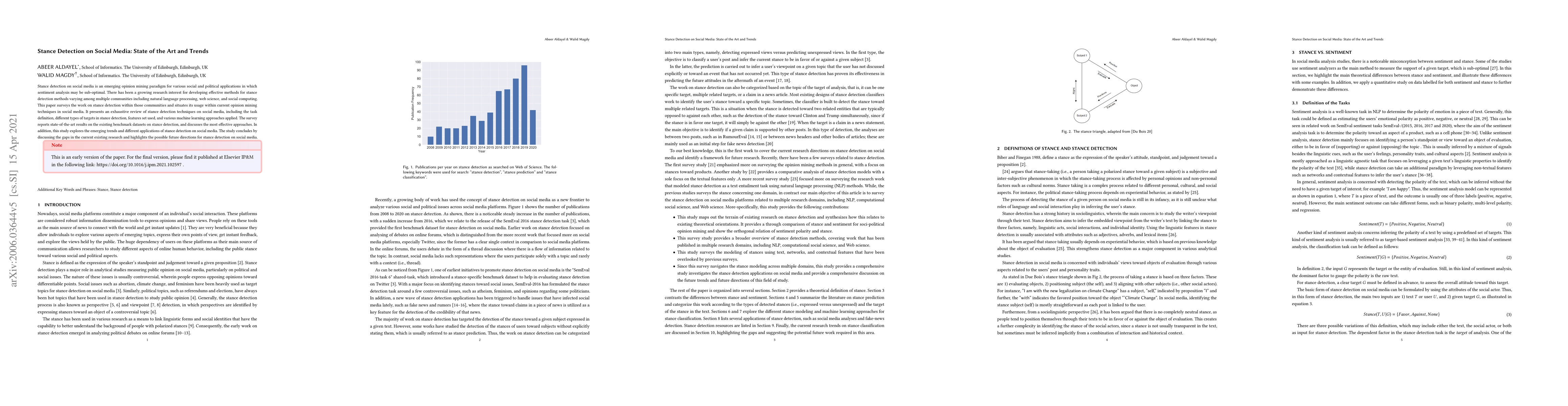 This paper provides a comprehensive review of stance detection techniques on social media, detailing task definitions, target types, feature sets, and machine learning approaches. It also discusses current state-of-the-art results and emerging trends, highlighting gaps and future research directions in the field.
