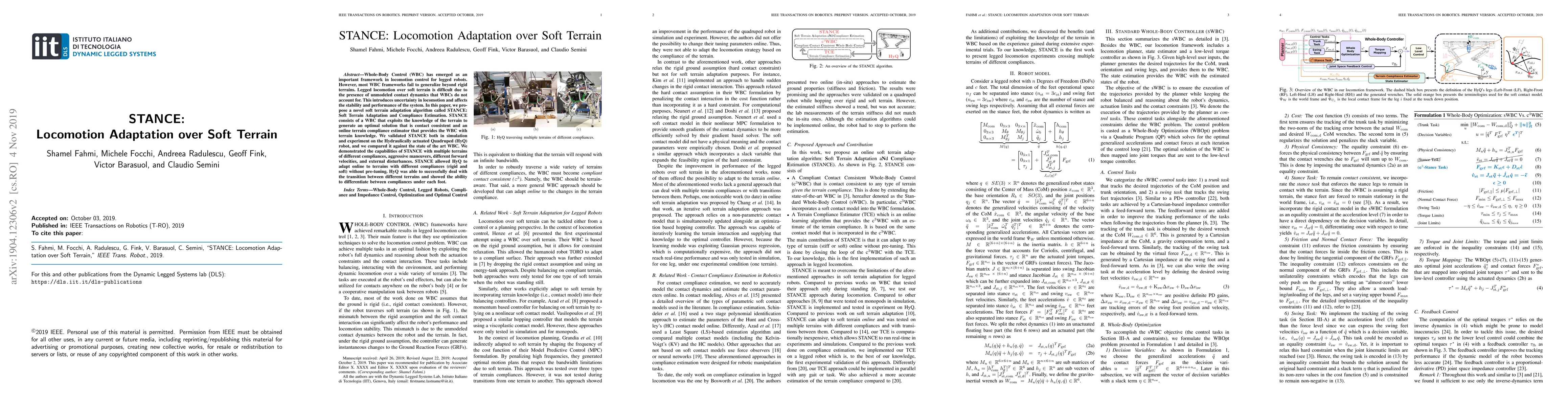 This paper introduces STANCE, a novel algorithm for legged robot locomotion adaptation over soft terrain, combining a Whole-Body Control framework with an online terrain compliance estimator. The approach enables the Hydraulically actuated Quadruped (HyQ) robot to dynamically adapt to various terrains without pre-tuning, demonstrating successful transitions and compliance differentiation.