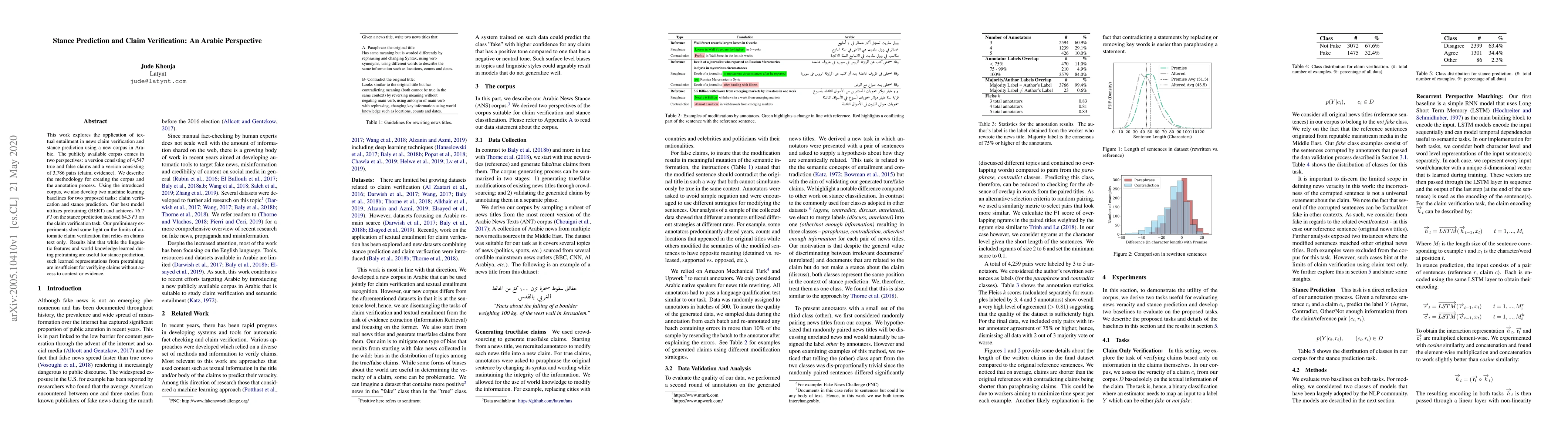 This paper develops an Arabic corpus for claim verification and stance prediction, employing BERT for machine learning models, achieving 76.7 F1 for stance prediction and 64.3 F1 for claim verification, indicating limitations in verifying claims based solely on text.