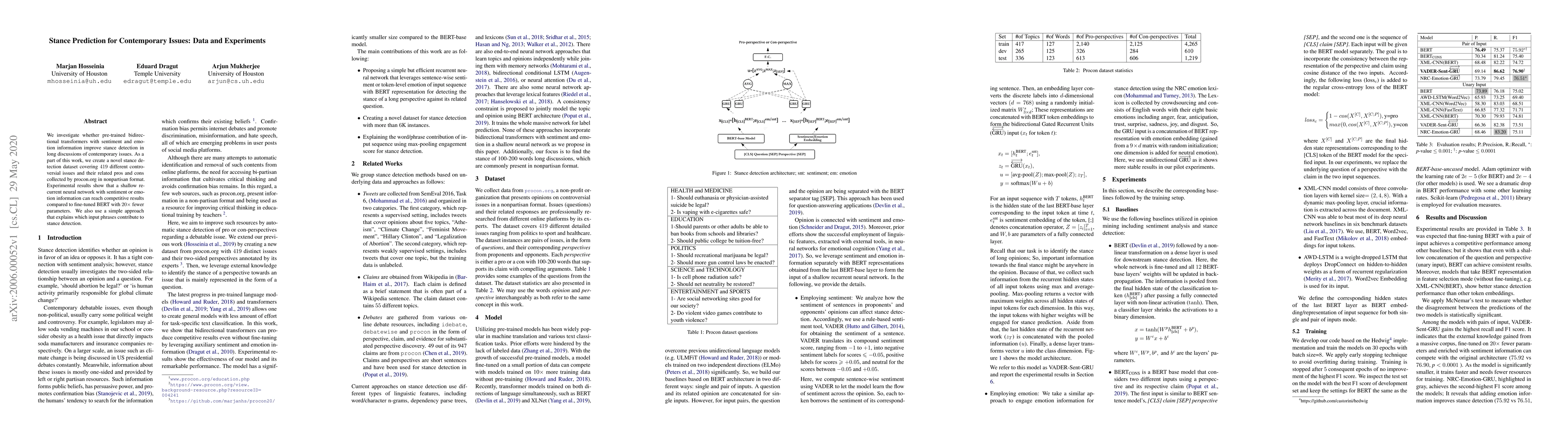 We investigate whether pre-trained bidirectional transformers with sentiment and emotion information improve stance detection in long discussions of contemporary issues. As a part of this work, we create a novel stance detection dataset covering 419 different controversial issues and their related pros and cons collected by procon.org in nonpartisan format. Experimental results show that a shallow recurrent neural network with sentiment or emotion information can reach competitive results compared to fine-tuned BERT with 20x fewer parameters. We also use a simple approach that explains which input phrases contribute to stance detection.
