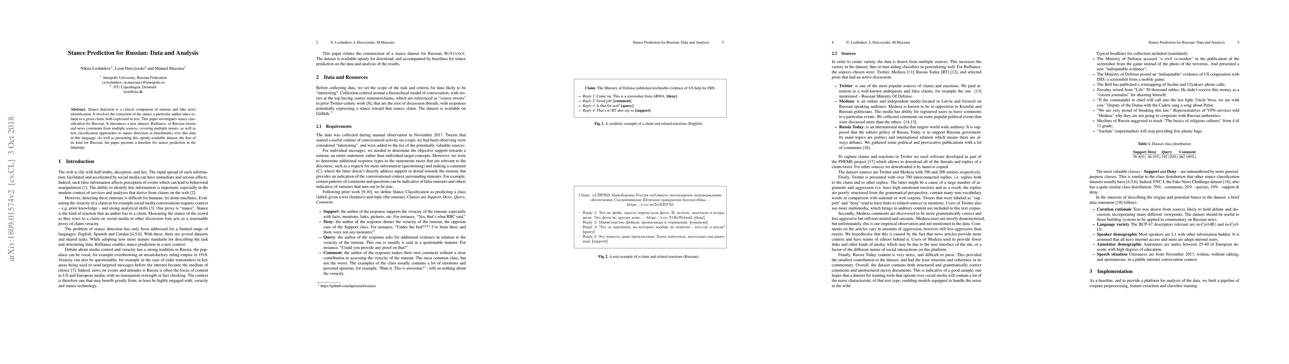This paper introduces RuStance, a novel dataset for stance detection in Russian language, consisting of tweets and news comments. It also presents baseline models for stance prediction, aiming to advance research in identifying author stances related to claims in Russian texts.