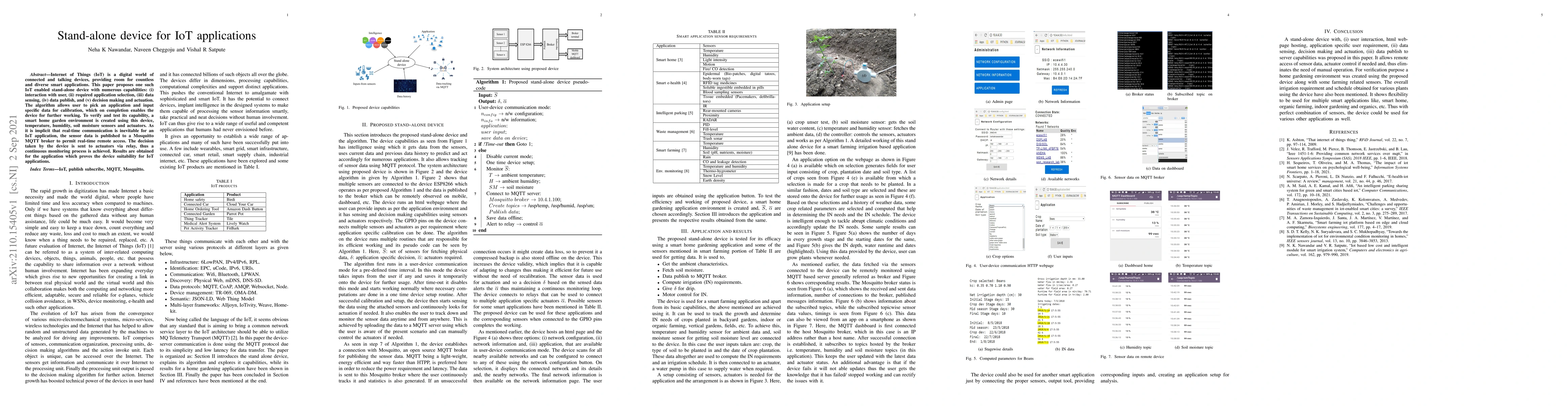 Internet of Things (IoT) is a digital world of connected and talking devices, providing room for countless and diverse smart applications. This paper proposes one such IoT enabled stand-alone device with numerous capabilities: (i) interaction with user, (ii) required application selection, (iii) data sensing, (iv) data publish, and (v) decision making and actuation. The algorithm allows user to pick an application and input specific data for calibration, which on completion enables the device for further working. To verify and test its capability, a smart home garden environment is created using this device, temperature, humidity, soil moisture sensors and actuators. As it is implicit that real-time communication is inevitable for an IoT application, the sensor data is published to a Mosquitto MQTT broker to permit real-time remote access. The decision taken by the device is sent to actuators via relay, thus a continuous monitoring process is achieved. Results are obtained for the application which proves the device suitability for IoT applications.